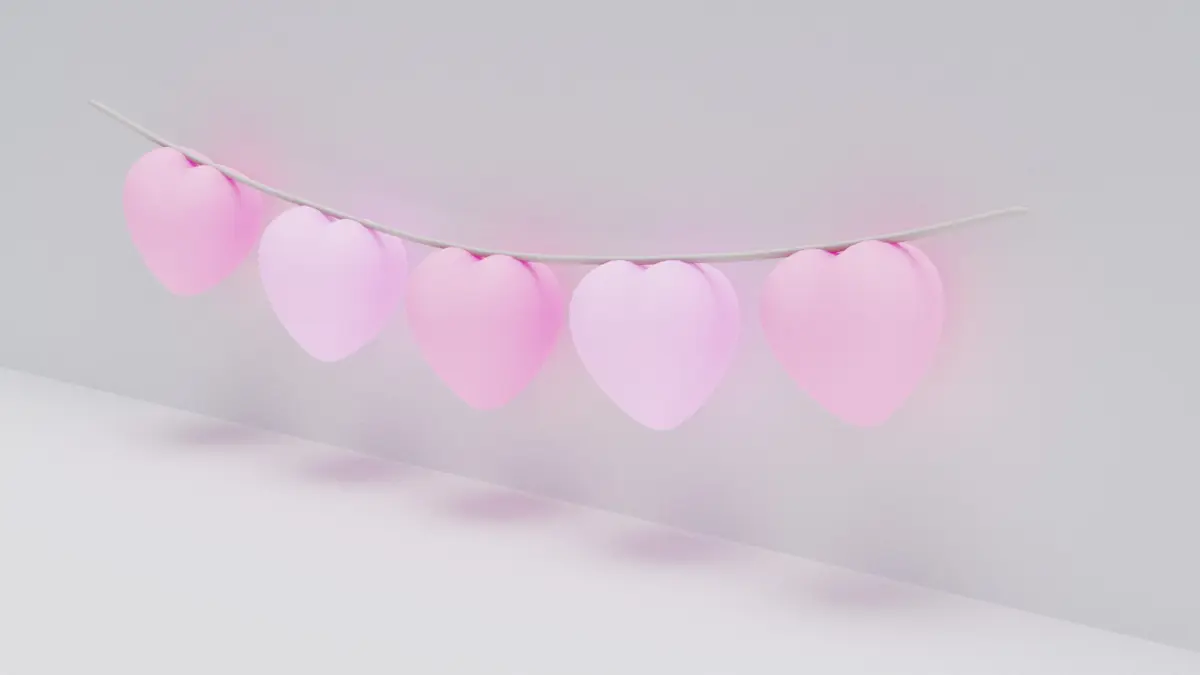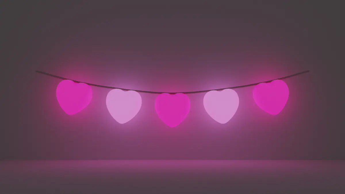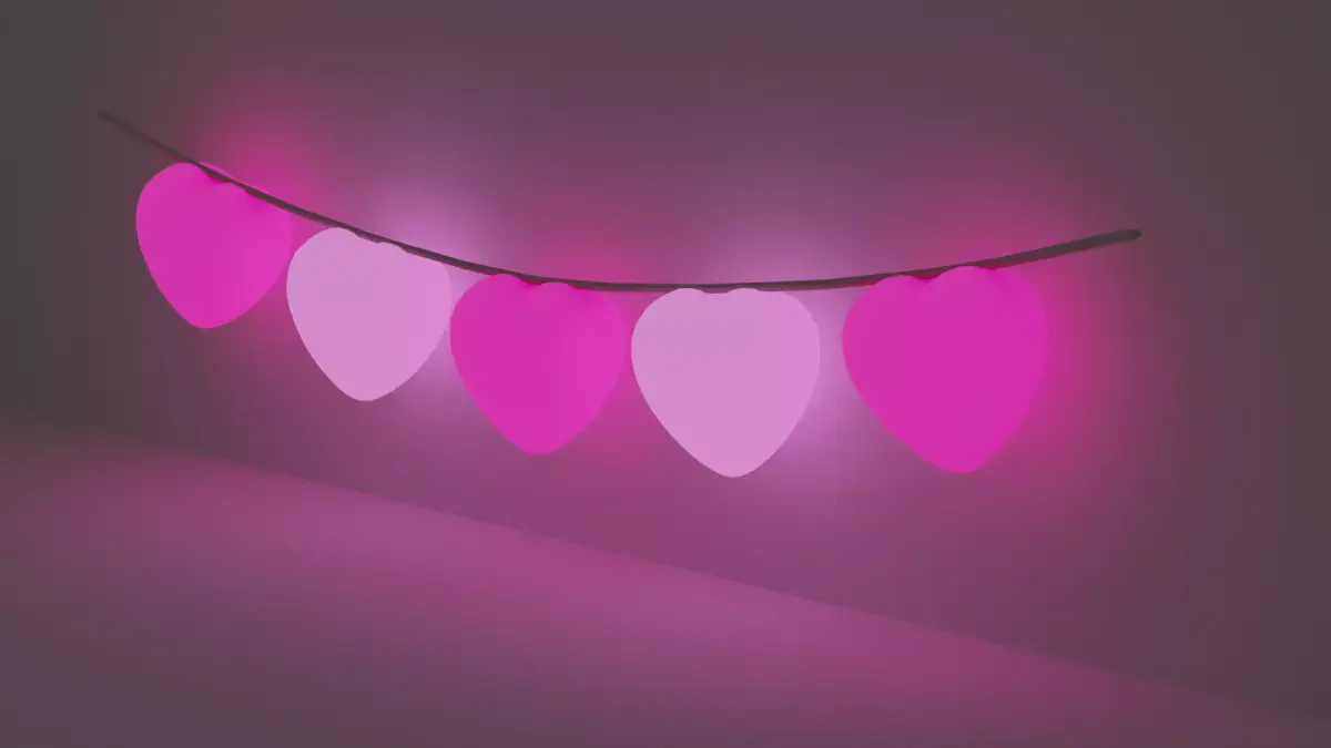 A stylized 3D heart garland featuring five heart-shaped lights glowing alternately in soft pink and rose tones. Perfect for romantic, cozy, or playful scenes. This cute decorative prop is ideal for Valentine's Day renders, children's rooms, or UI/game design. Comes with PBR textures for a polished and appealing look in both real-time and pre-rendered projects.