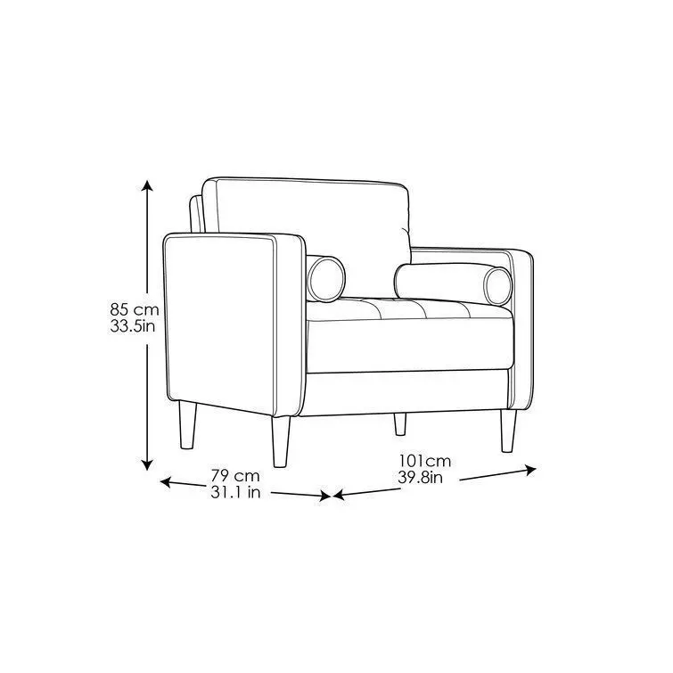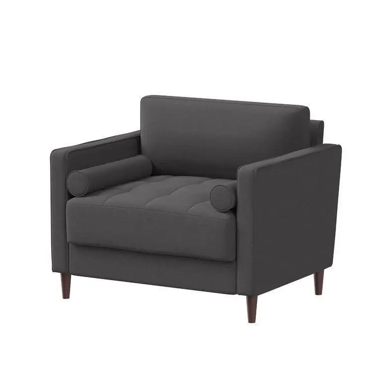- A marriage of comfort and contemporary allure, the eye-catching arm chair is sure to lend style to your living room look. The chair is founded atop four tapered wooden feet, and its clean-lined frame is crafted from kiln-dried hardwood and is covered in polyester Navy blue or heather grey upholstery. This chair's high density foam cushioning provide ultimate comfort to last. While the Garren Chair's solid hue fabric makes it a stylish stage for plush patterned pillows and faux fur blankets, it's equally elegant all on its thanks to its square arms, a button-tufted seat cushion, and included bolster pillows.