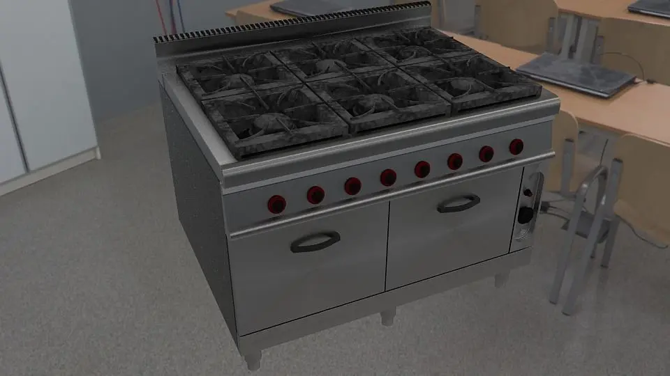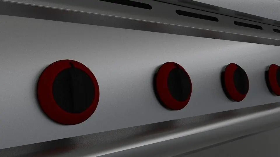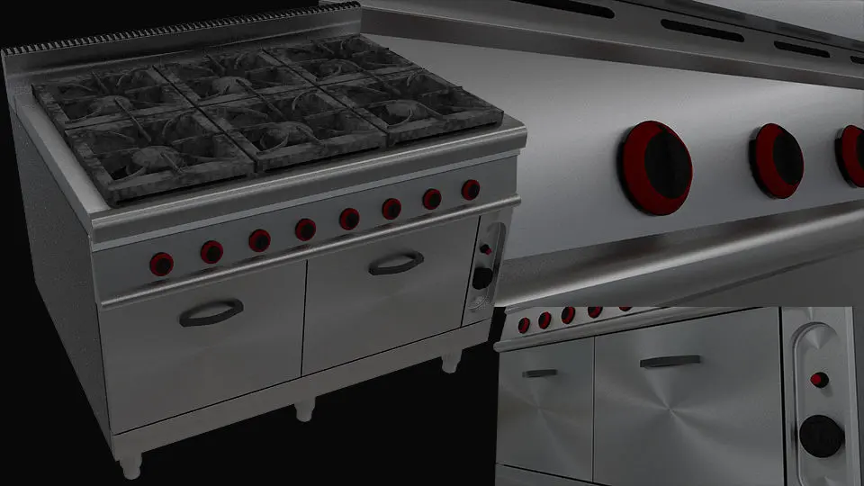 Industrial type gas cooker with oven in great detail and materials ready to render.Buttons oriented for easy rotating. Hierarchy and pivots organized for easy manipulation, as well as namespaces.