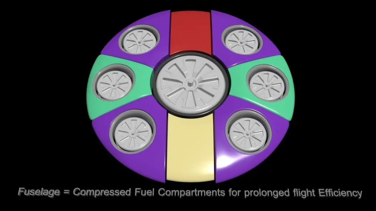 The Fuselage shape doubles as a compressed fuel tank, saving mass for prolonging drone flight. The Fuselage Sections can be mounted together using a magnetic lock for instance, or the old fashioned way of course, together forming a strong lightweight structure allowing for prolonged Blimp drone flight.