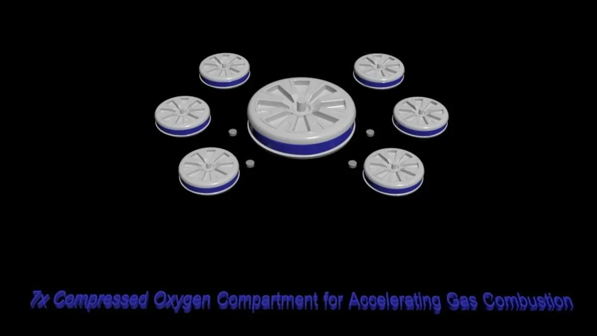 LPG gas is a lightweight combustible fuel, with already known technology behind it, perhaps combined with pure compressed oxygen to greatly expand the combustion, or even power the rotor blades directly. Gas can be heated and expanded but a motor will probably be most efficient for this. LPG is not as aggressive as an electric motor, but when using many blades for more silence, and using many blades to dampen the effect can result in a very smoothed out flight. a little bit of lag might make it easier for passengers aboard the blimp craft to adjust. we dont want super sudden moves with passengers on board anyway.