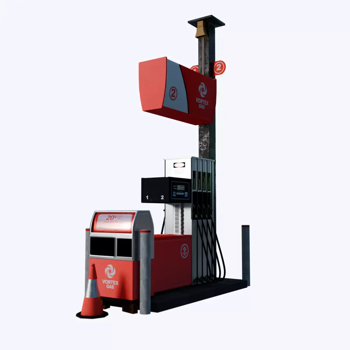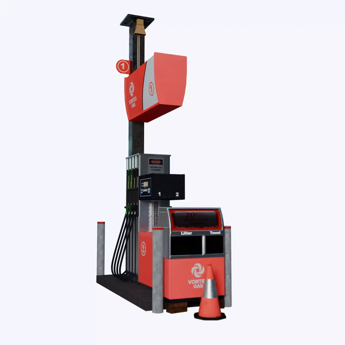 The model includes detailed fuel hoses, digital screens, a trash bin, warning cone, and clean texturing with branded “Vortex Gas” decals.