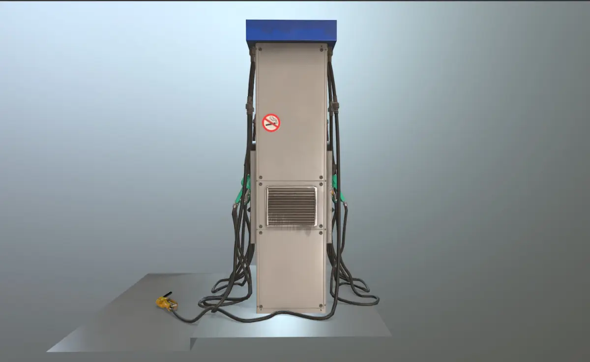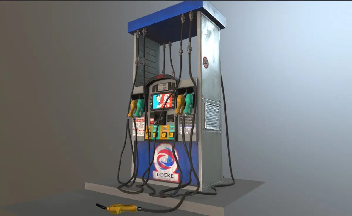Game ready PBR asset. This is a modern gas / petrol pump found in gas stations. It has a central display and four pumps on each side. Some of the included elements are, fuel connectors, hose, fuel handles, advertisments and flyers, four pumps on each side.