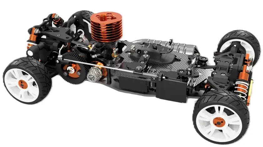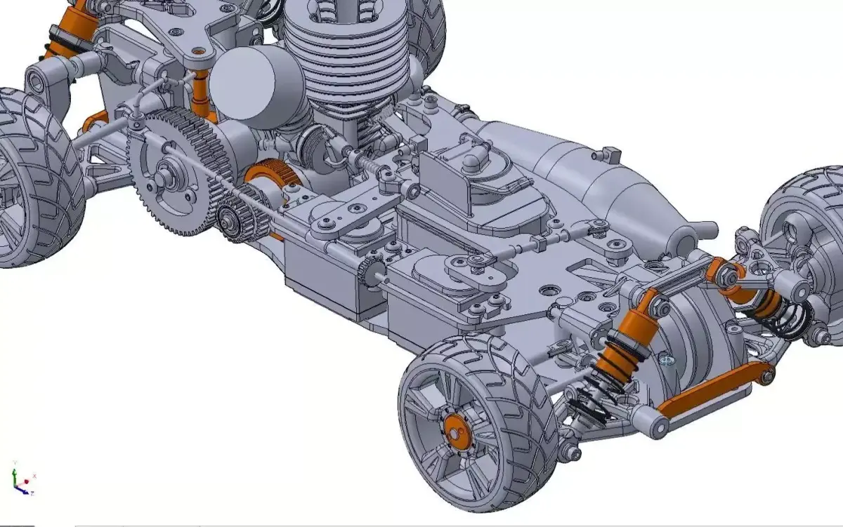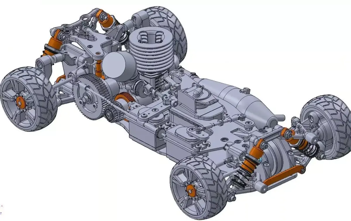 Key Features• Complete gasoline vehicle chassis assembly• Internal combustion engine integration• Steering and drivetrain mechanism• Independent suspension with shock absorbers• Differential and gear transmission system• Exhaust system routing• Wheel hub and steering linkage assembly• High-detail mechanical component structure
