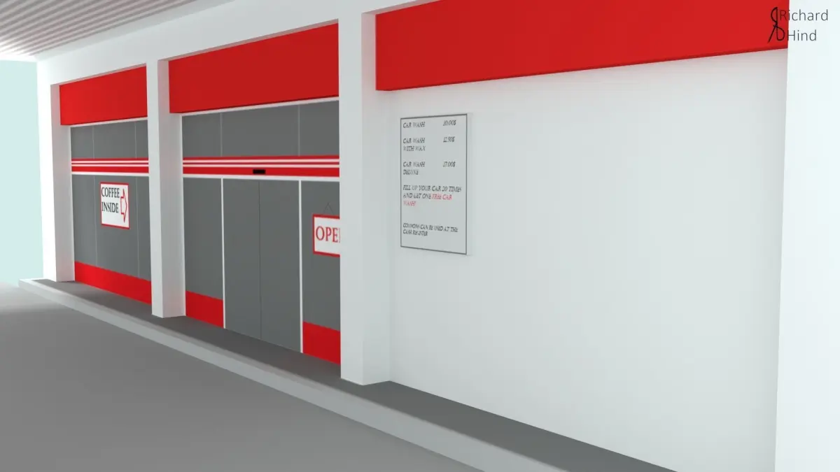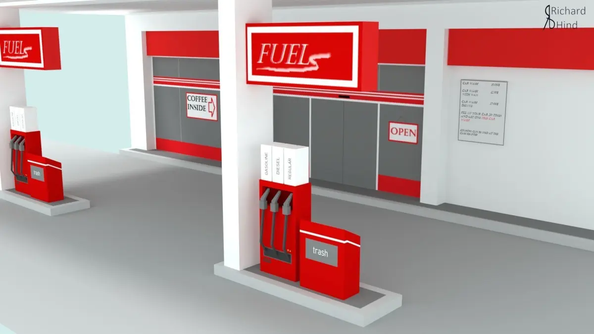 The model was created and rendered in Blender. One gas station (2 objects) has 898 vertices and 534 tris/faces.