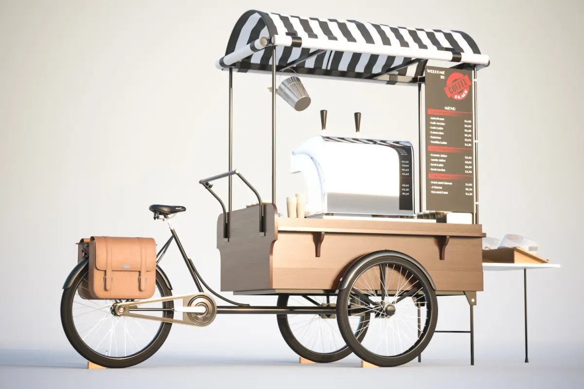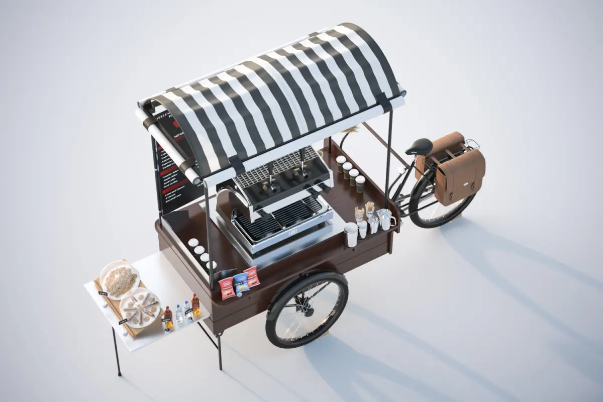 This realistic model includes gastronomic bicycle intended for making coffee. Kept in a retro style.Model prepared for 3d architectural visualisations and other graphic works.