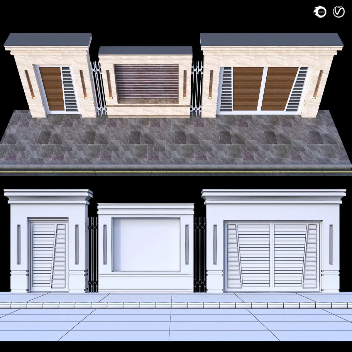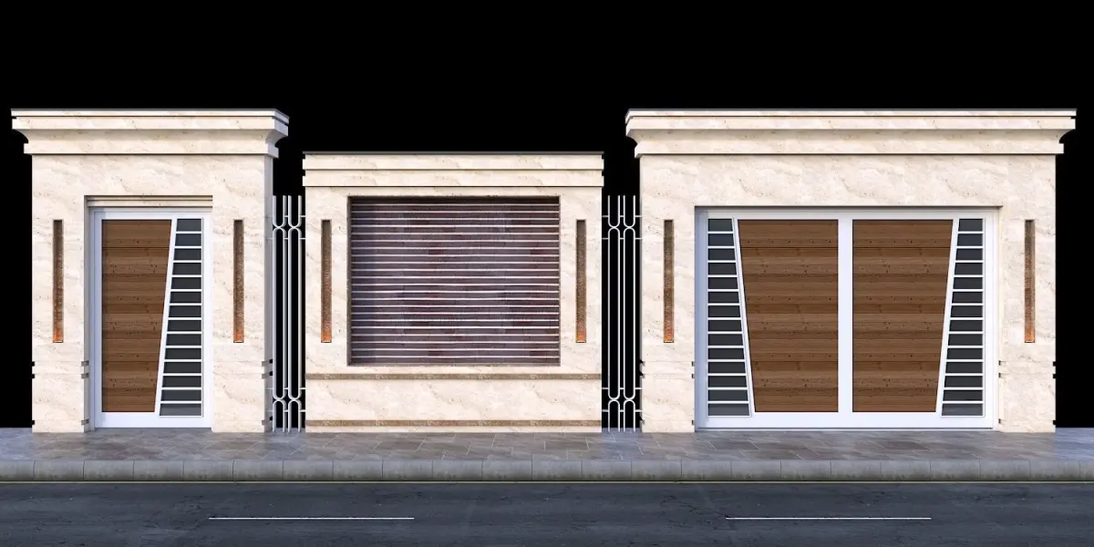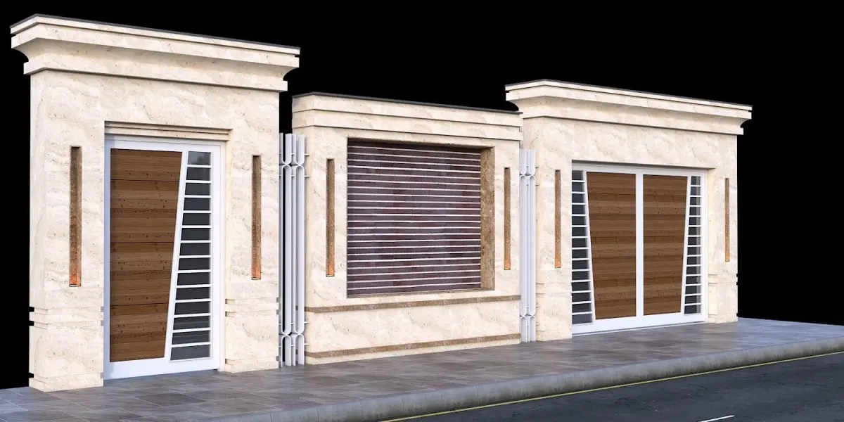 This is a modern door entrance. A combination of metal, stone and wood. It has a car entrance and a pedestrian entrance with a middle wall design that makes the work beautiful. The columns have spaces for lighting that are very attractive at night. I hope you find it interesting.