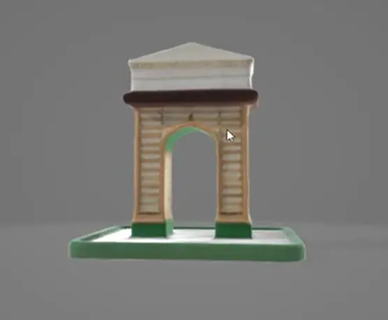 A detailed 3D model of the Gateway of India in Mumbai, showcasing its grand Indo-Saracenic arch, intricate stone carvings, and surrounding scenery like the Arabian Sea, tourists, and boats, with realistic textures and lighting.