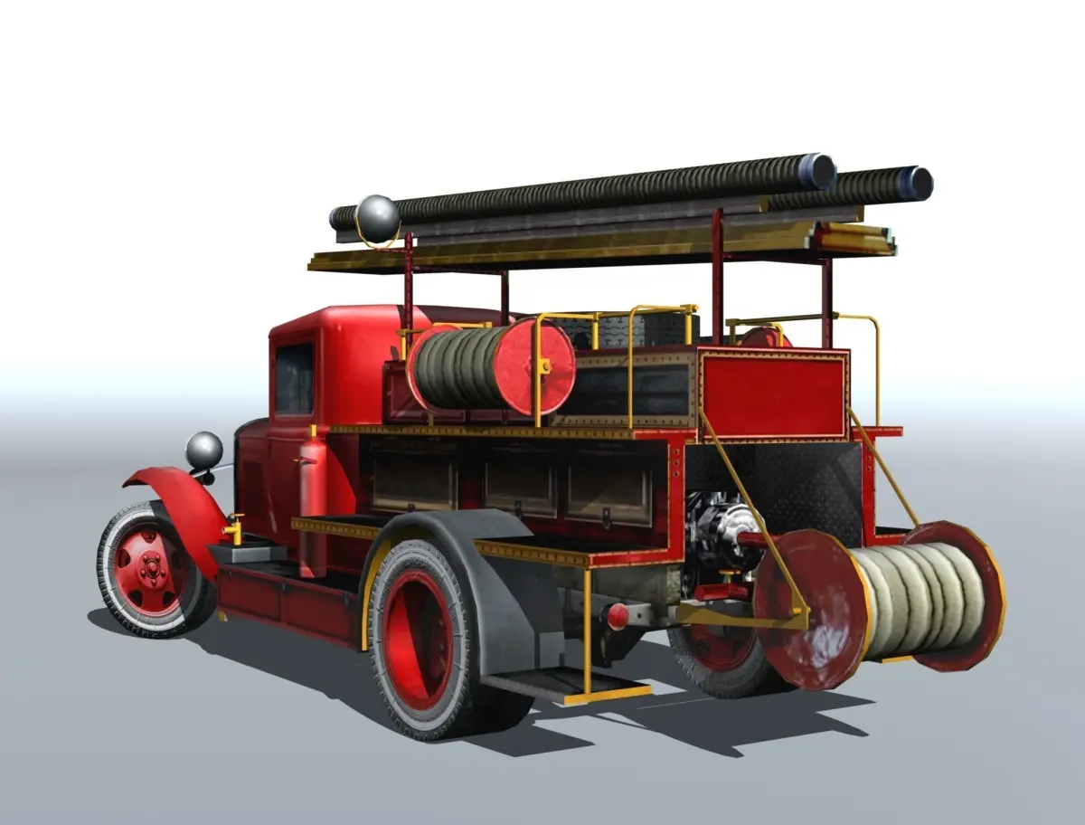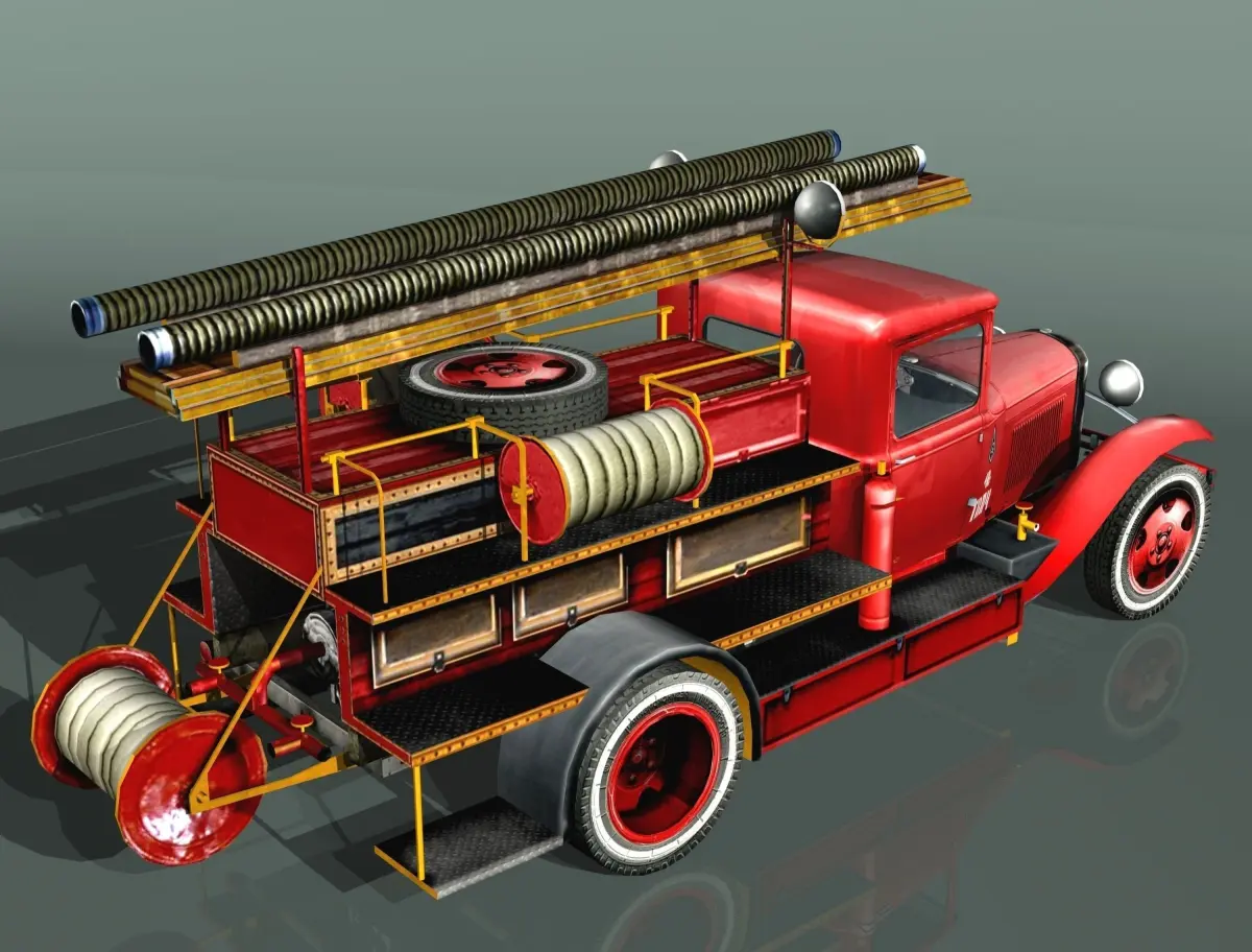 Fire truck type PMG-1 on chassis vehicle GAZ-AA "Lorry".Static low poly (faces: 8729, vertexes: 5193, poly: 3322) 3D model for installation in scenes, in scenarios, or as static model for simulators and games.Has the cabin interior. Optimised mesh..The archive contains the model file (3dsmax2009), texture (.JPG), the file extension in the format .uvwIt is also exporting models in the following formats: .FBX, .3DS, .OBJ.