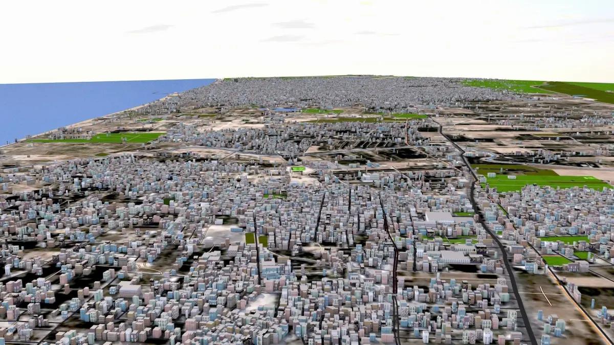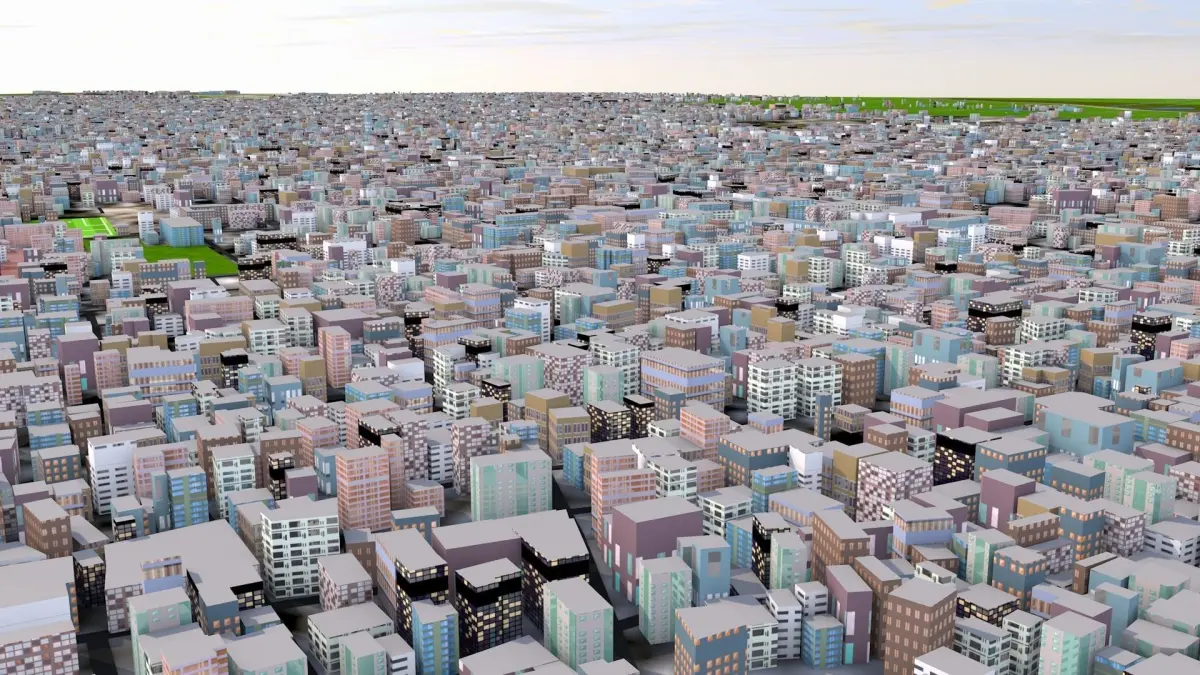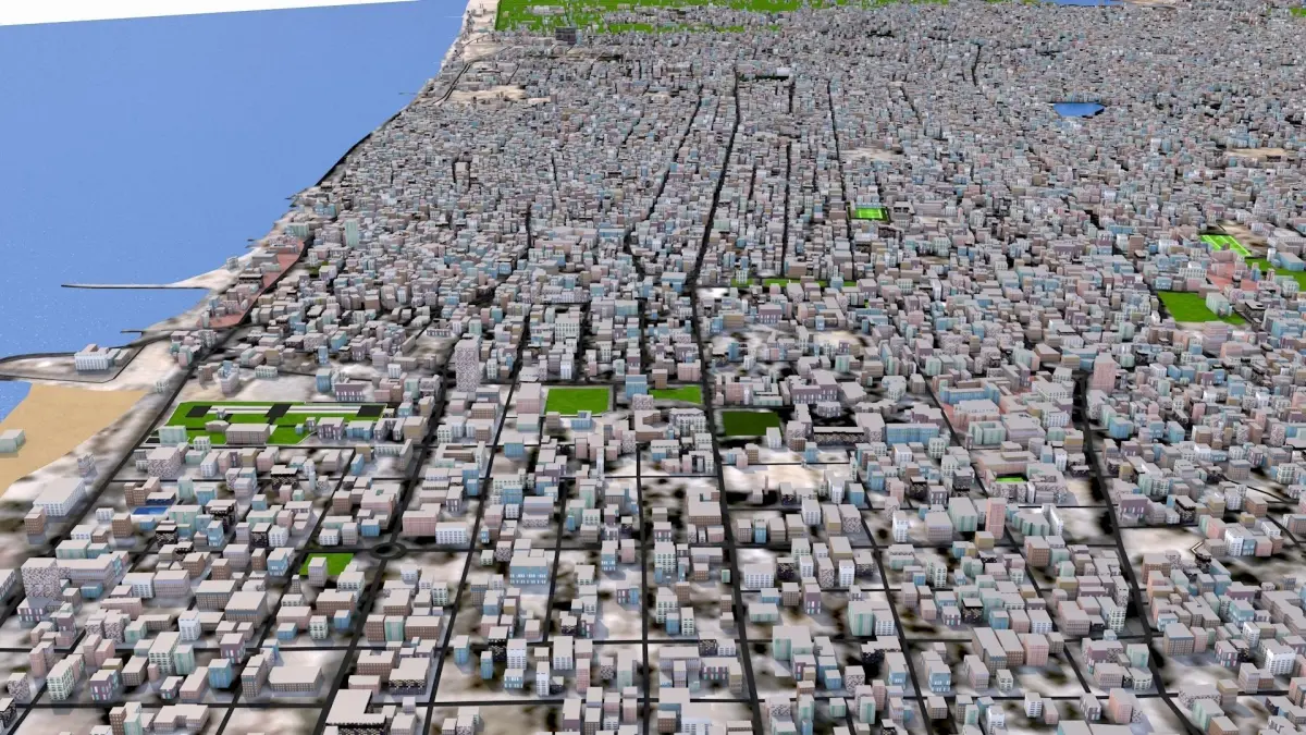 Based on April 2021 GIS data. -Clean scene with UV mapped and textured buildings. 50 Building types (based on map data, office, school, hospital, cafe, university, house etc) provided in separate files.
