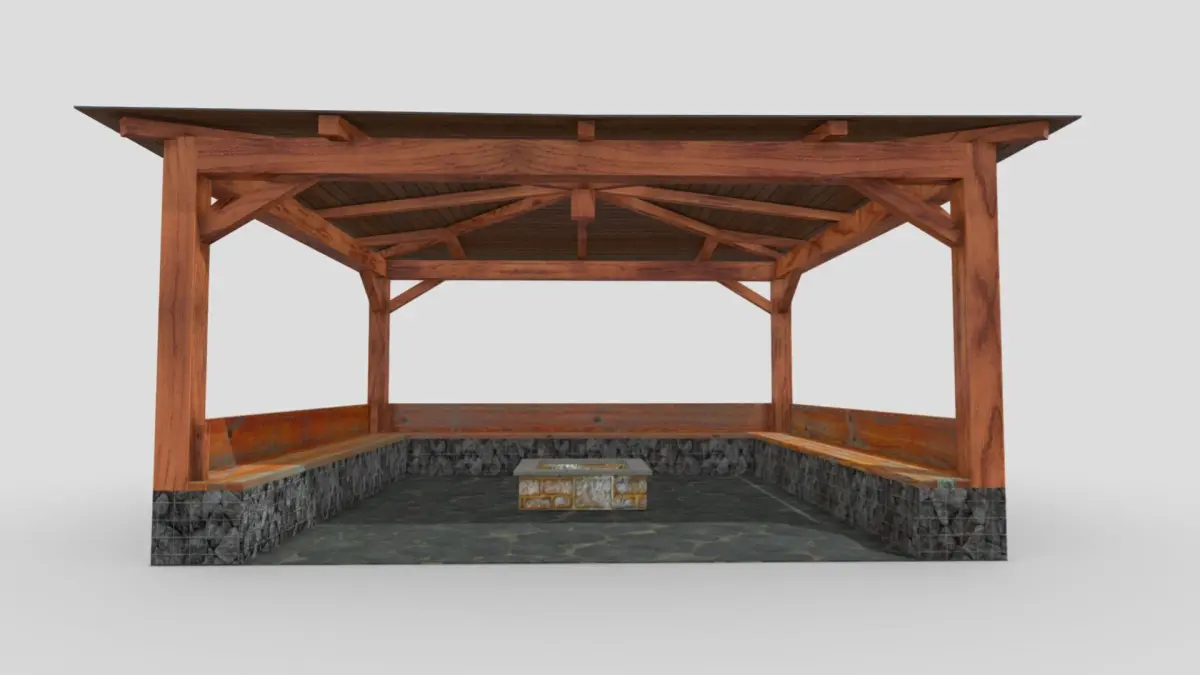 A large wooden gazebo with a dark pitched roof, supported by thick timber beams. The structure features built-in wooden seating along the inner sides and is enclosed by low stone walls. In the center, there is a square stone fire pit placed on a textured stone floor, creating a cozy and rustic outdoor atmosphere.