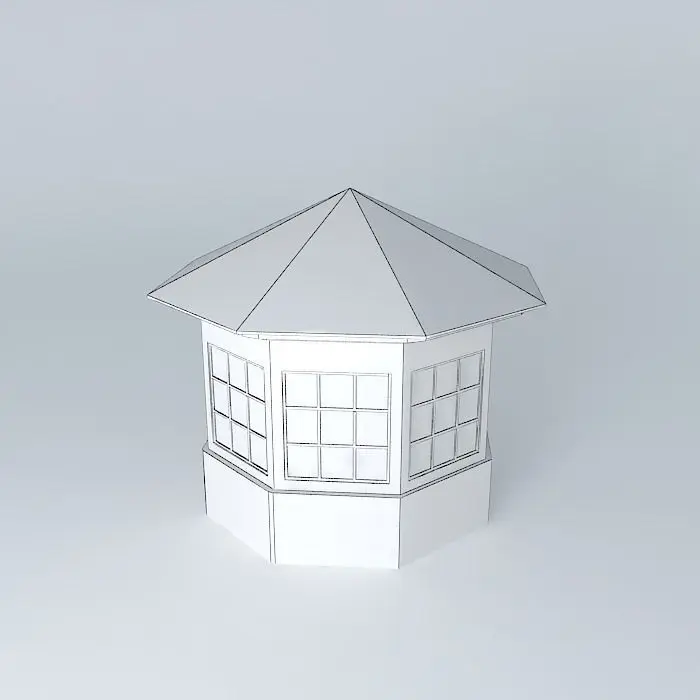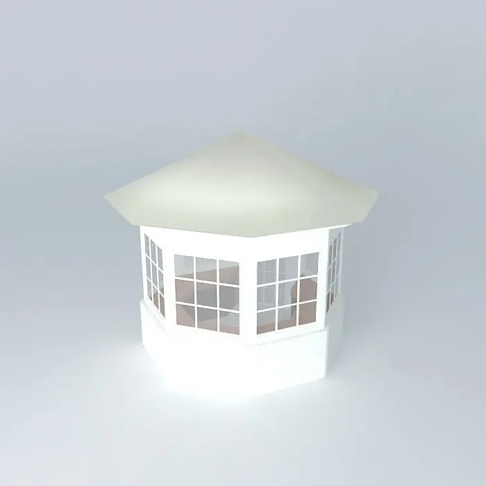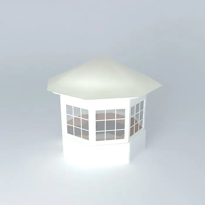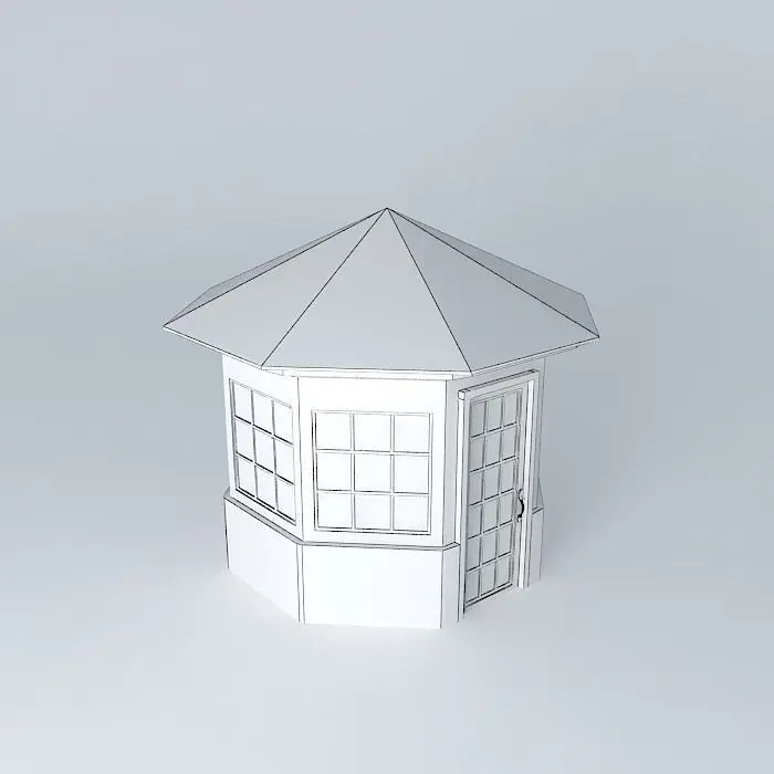 A octagon shaped Gazebo with multi panel windows, windoe pane door, and shingled roof. Inside a surround bench with leather cushions.