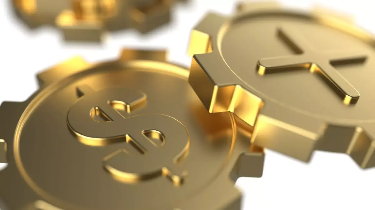 The model represents a symbolic fusion of money and industry — a dollar-engraved coin shaped like a gear.