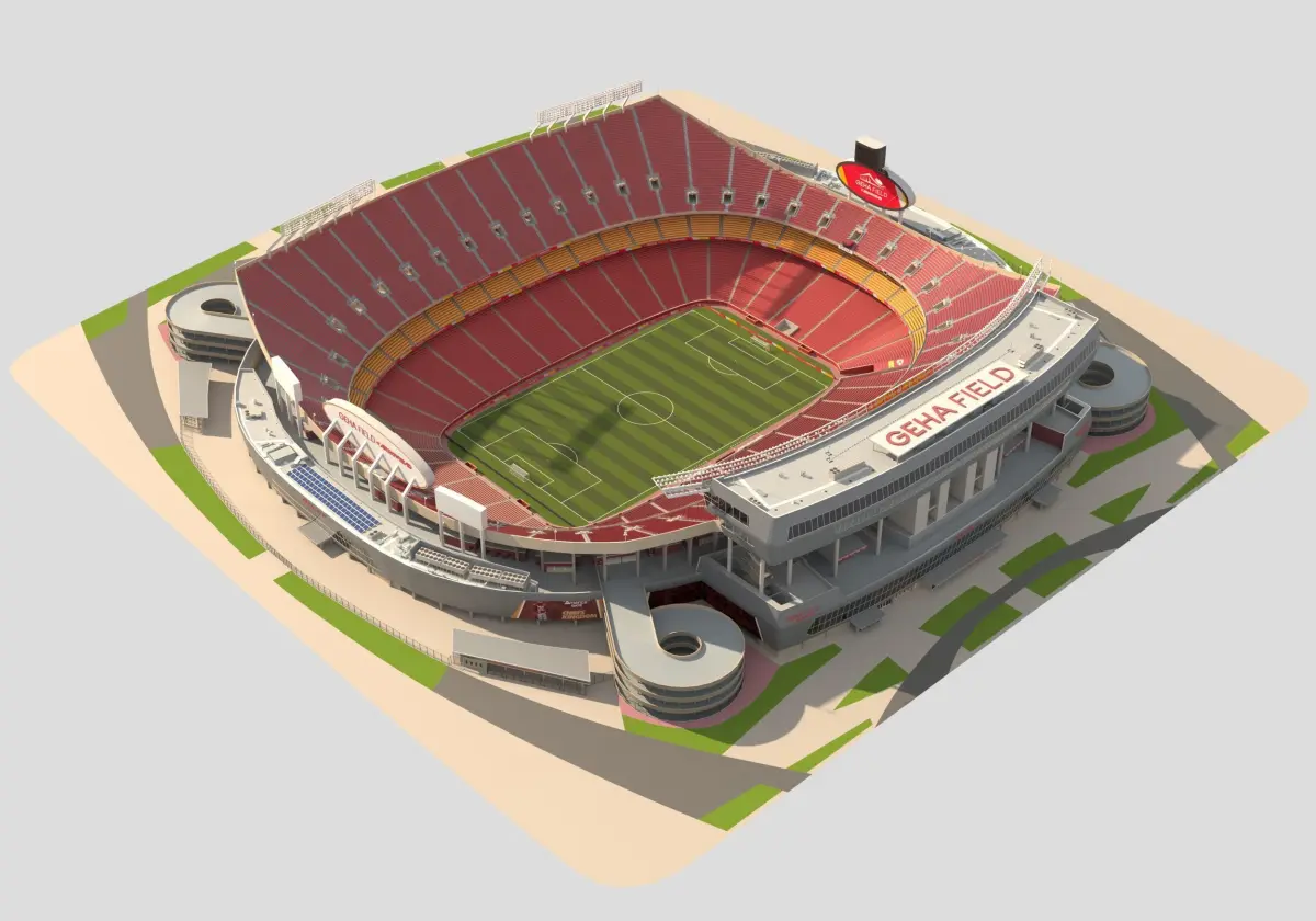 Geha Field also known as Arrowhead Stadium is a multi-purpose stadium in Kansas City, Missouri, United States. It was opened in 1972 and renovated in 2010. This stadium participates in the 2026 FIFA World Cup. The 3D model was created on a real base. It’s created accurately, in real units of measurement according to blueprints and images. The model contains two types of fields, for rugby and soccer. The model is placed in the center of the scene. All preview images shown are rendered with Corona Render and Corona materials (studio environment is not included in the set). For your convenience, it contains separate 3ds max files for different render plugins. One with Corona materials, one with Vray materials and another with standard materials. The model is provided combined, all main parts are presented as separate parts and have unique names therefore materials of objects are easy to modify. Other than 3dsmax files (fbx, mb, obj) include only standard materials. No special plugin is needed to open the scene. All the textures and materials are included and mapped. All ways to the textures are removed.