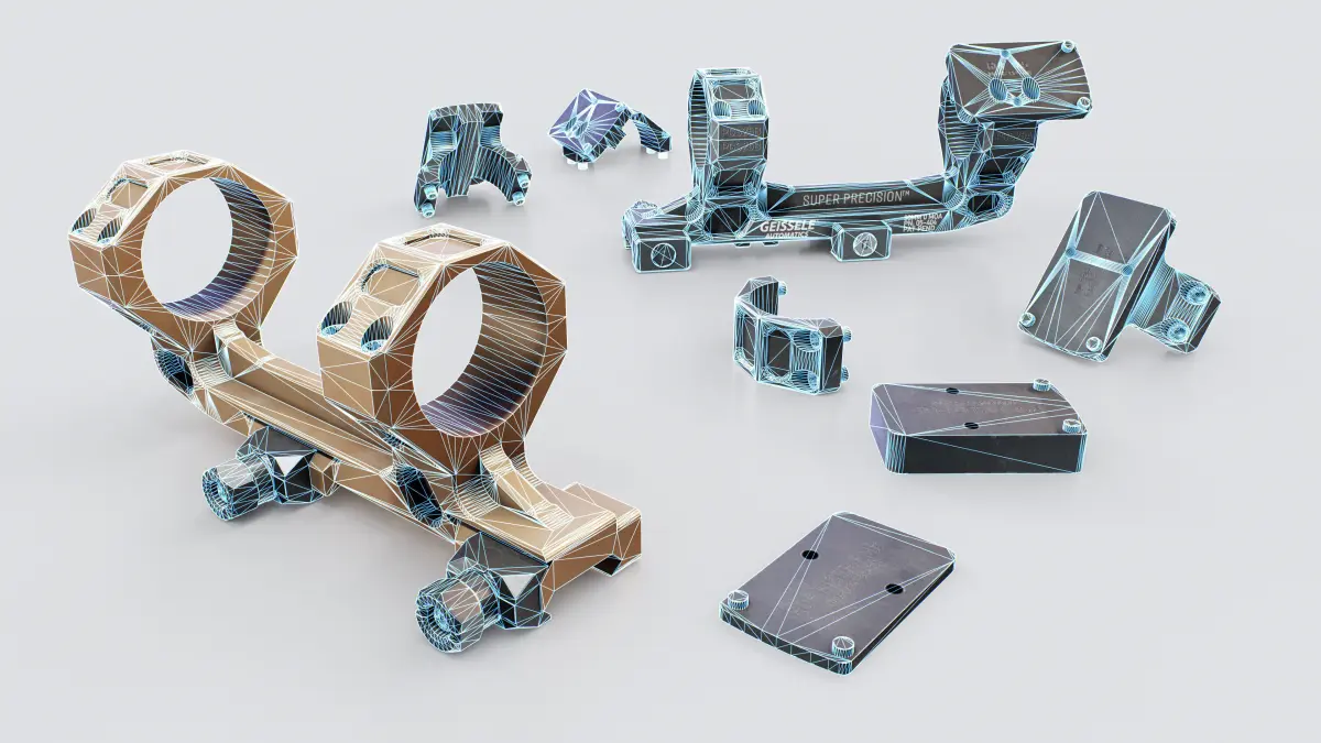 Game ready model of the Geissele Automatics Super Precision 30mm and 34mm Scope Mount for Low Power Variable Optics and Precision Rifle Scopes, with an integrated Micro Red Dot Sight mount in 4 positions: Front Top, Front Offset, Rear Top, and Rear Offset.