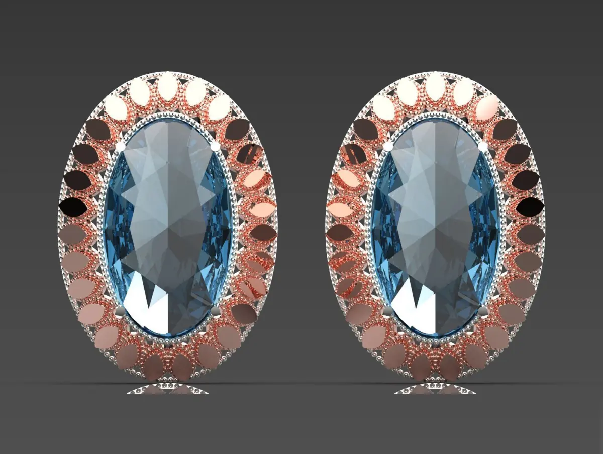 These earrings feature a stunning design with large, oval-shaped blue gemstones at the center, surrounded by a decorative frame. The frame consists of alternating polished rose gold and silver elements, creating a visually striking contrast. The gemstones are cut with many facets, enhancing their sparkle and brilliance. The overall design is elegant and would make a beautiful statement piece for formal occasions or special events.