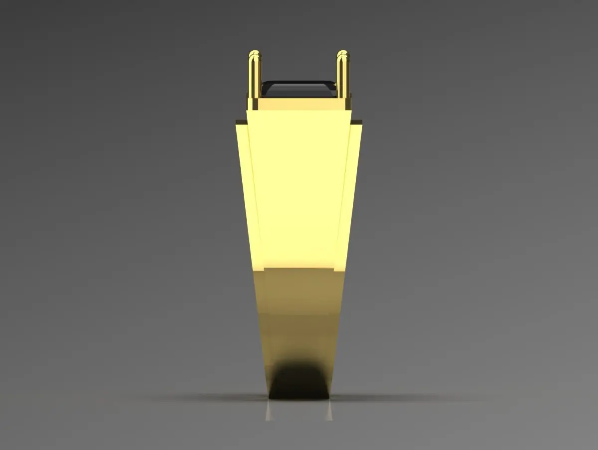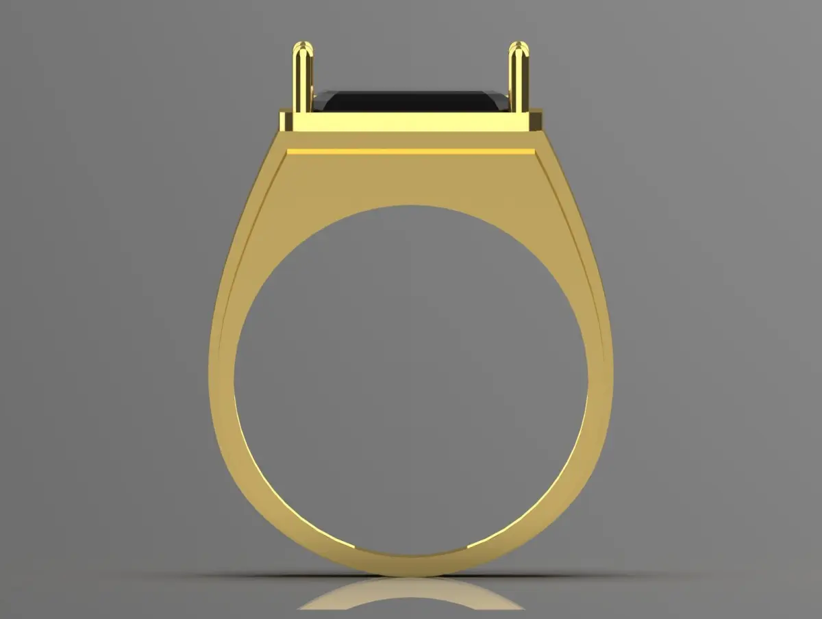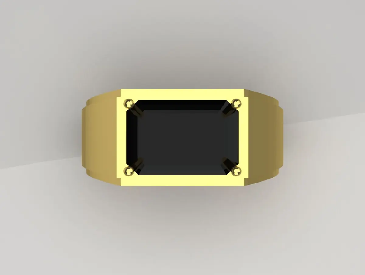 The image shows a 3D rendering of a gold ring with a modern, angular design. The ring features a large, black rectangular gemstone set in a bezel setting, with four prominent gold prongs securing the stone. The band of the ring is broad and smooth, with slight angular facets that give it a contemporary appearance. The overall style of the ring is bold and elegant, combining luxury with a modern aesthetic.