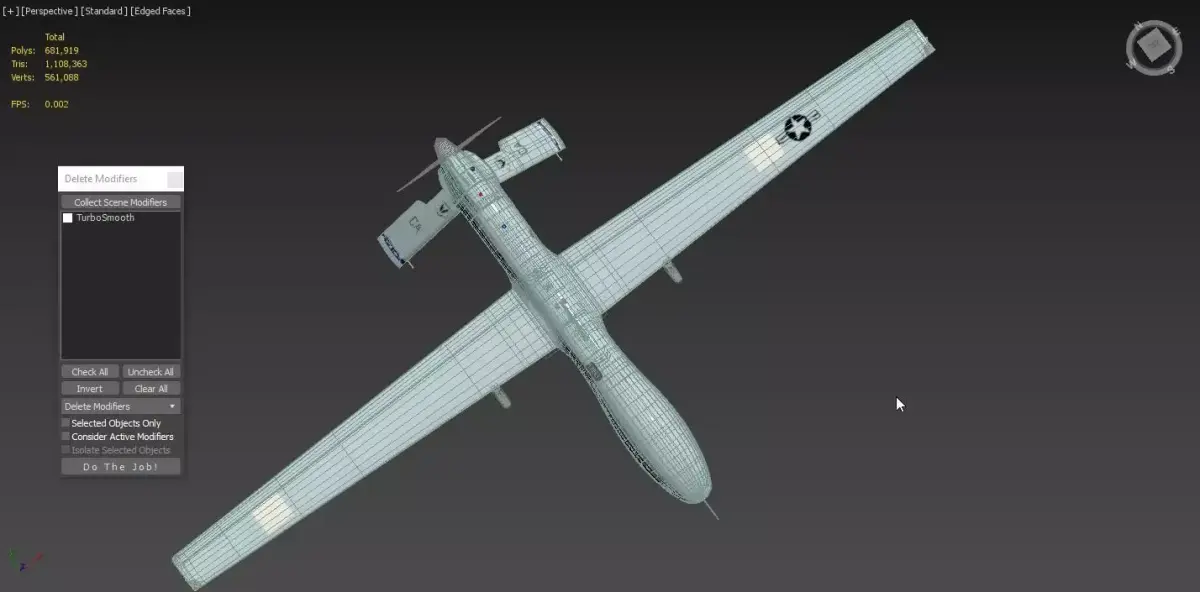 General Atomics MQ-1 Predator UAV Drone is a high-quality, photo-realistic 3d model that will enhance your rendering projects' detail and realism. The model has a fully textured, detailed design that allows for close-up renders, and was modeled in 3ds Max 2018 and has a 3ds Max 2015 version, and rendered with V-Ray. Renders have no post-processing.