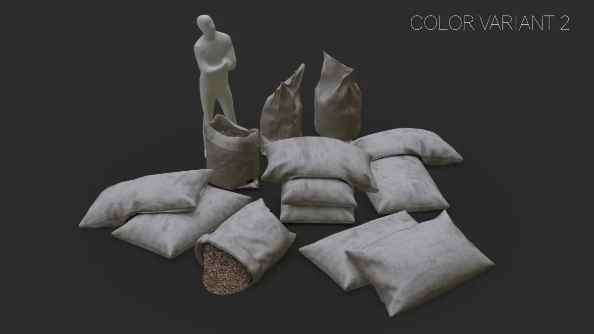 This vintage bulk bags assets pack including 10 individual bag sets and 2 content sets with 3 LODs and collision boxes to get the best optimization and the best quality for the most popular game engines. All elements can easily be positioned together to create a more detailed scene. Also, this pack includes 4 pre-assembled sets to allow you to speed up your assemblies and also to inspire you on the different ways of composing the elements together.