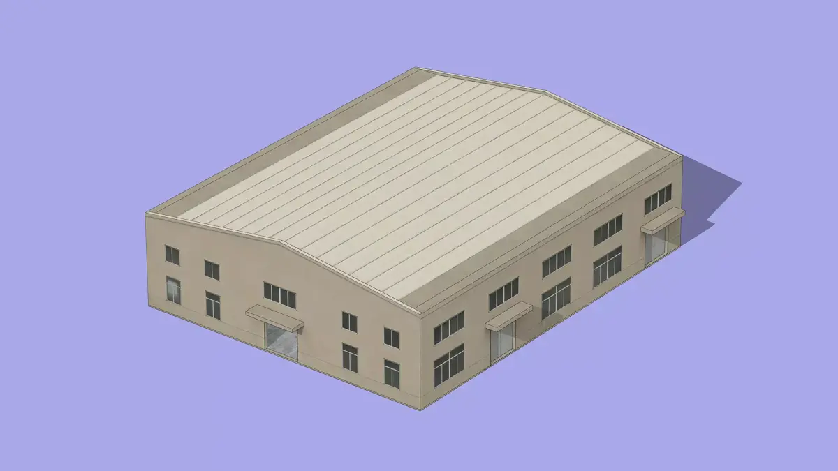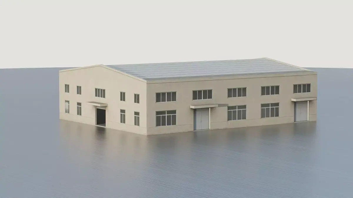 This is a low-poly 3D model of a generic industrial warehouse or factory. The design features a classic rectangular footprint with a pitched, corrugated metal roof and a solid, utilitarian facade. The structure includes multiple rectangular windows, a large loading bay door, and smaller personnel entrances, reflecting typical industrial functionality.Rendered with realistic materials and textures, this model strikes a balance between visual fidelity and performance efficiency. It is perfectly suited for architectural visualization, city-building simulations, logistics planning, or real-time game environments where resource optimization is key.