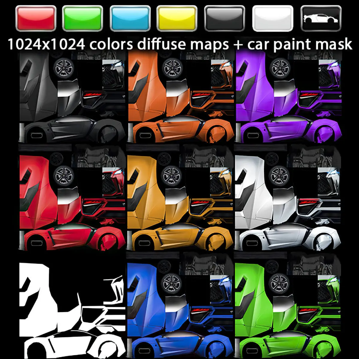 6 different colors 1024x1024 diffuse mapsYour own colors calibration 1024x1024 mask includedSeparated wheels with correct pivots