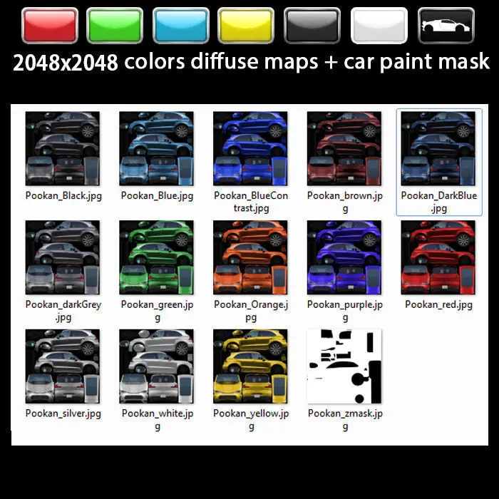 Many different colors 2048x2048 diffuse mapsYour own colors calibration 2048x2048 mask includedSeparated wheels with correct pivots