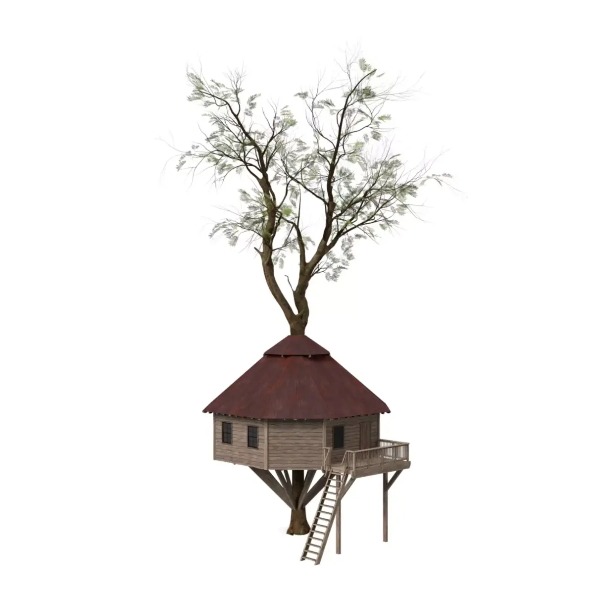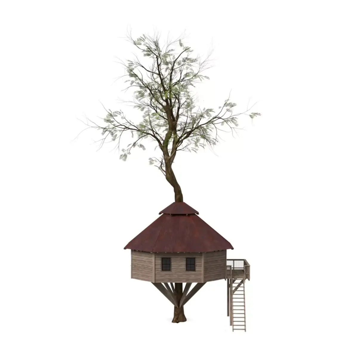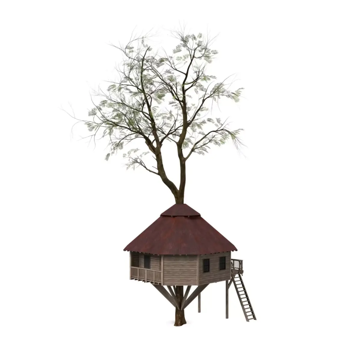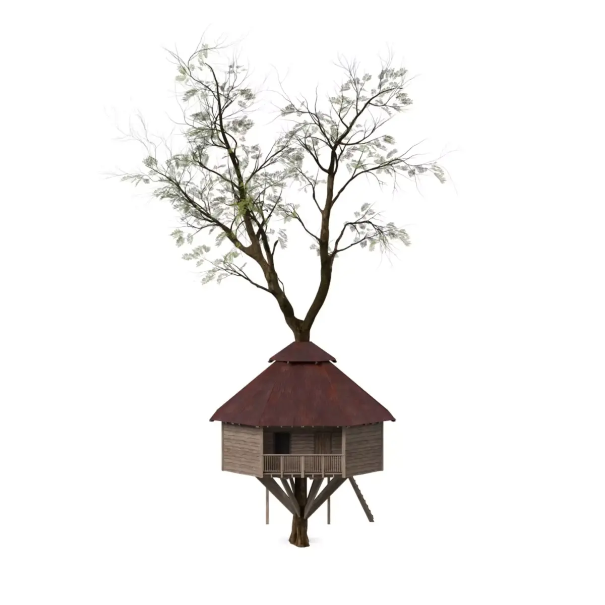 "A second variation of a classic wooden tree house, ideal for playful, rural, or natural settings.