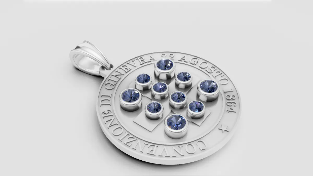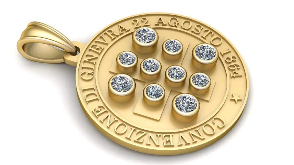 This distinguished gold pendant features a round medallion design inscribed with Convenzione di Ginevra 22 Agosto 1864, commemorating the historic Geneva Convention. At its center, a cross pattern is elevated and adorned with nine brilliant bezel-set diamonds, adding elegance and sophistication. The polished yellow gold finish combined with the meaningful inscription makes this pendant a perfect blend of history, symbolism, and fine craftsmanship.