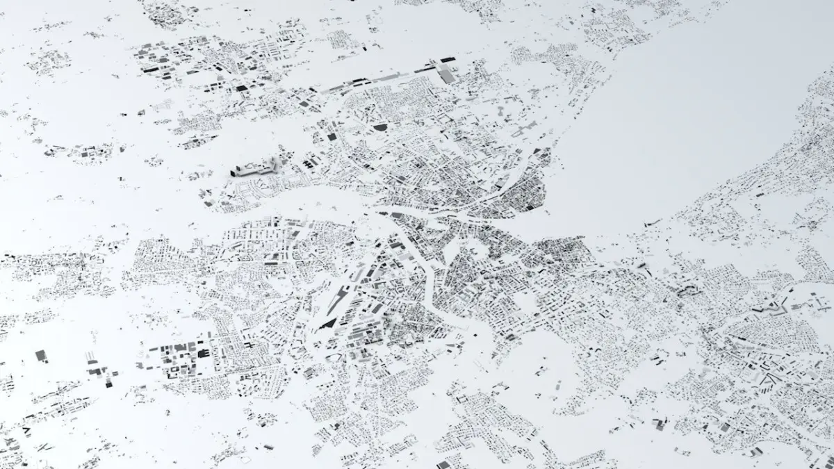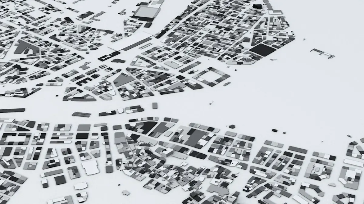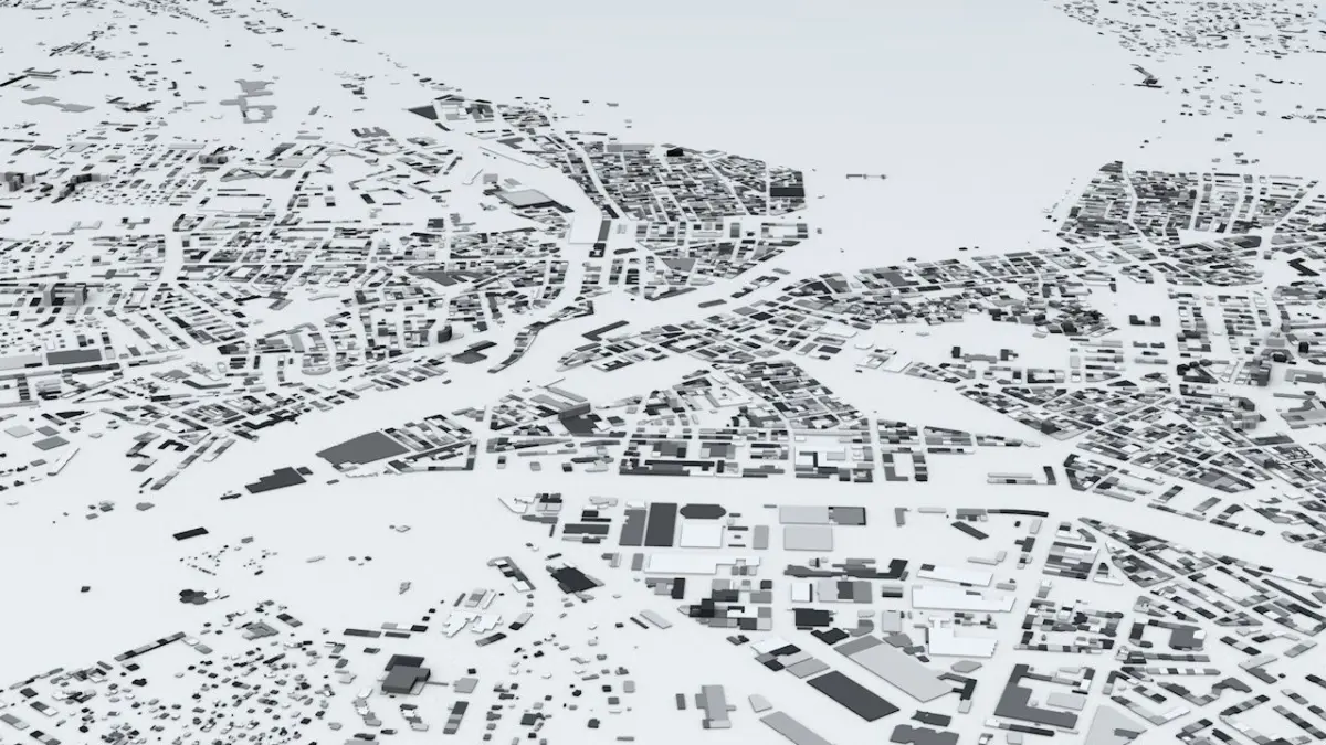 - the model is positioned on a flat surface (all buildings are on the “floor” - no elevation data included)