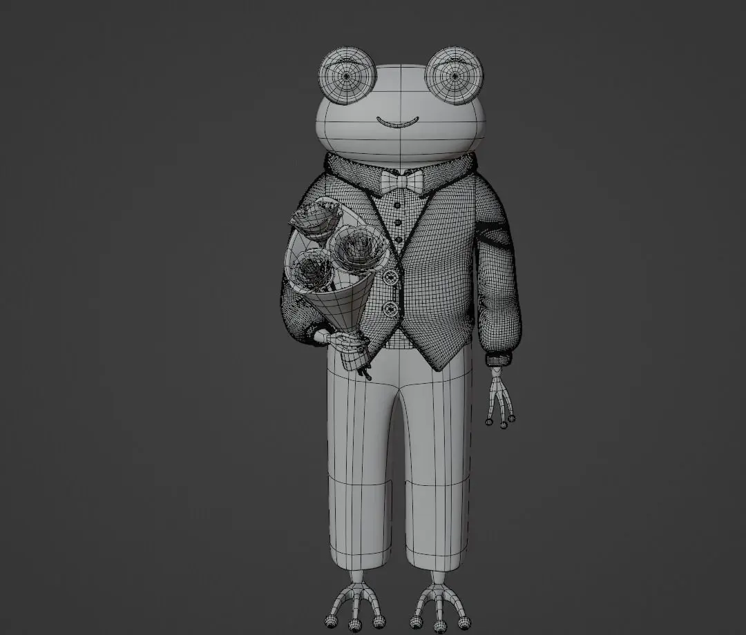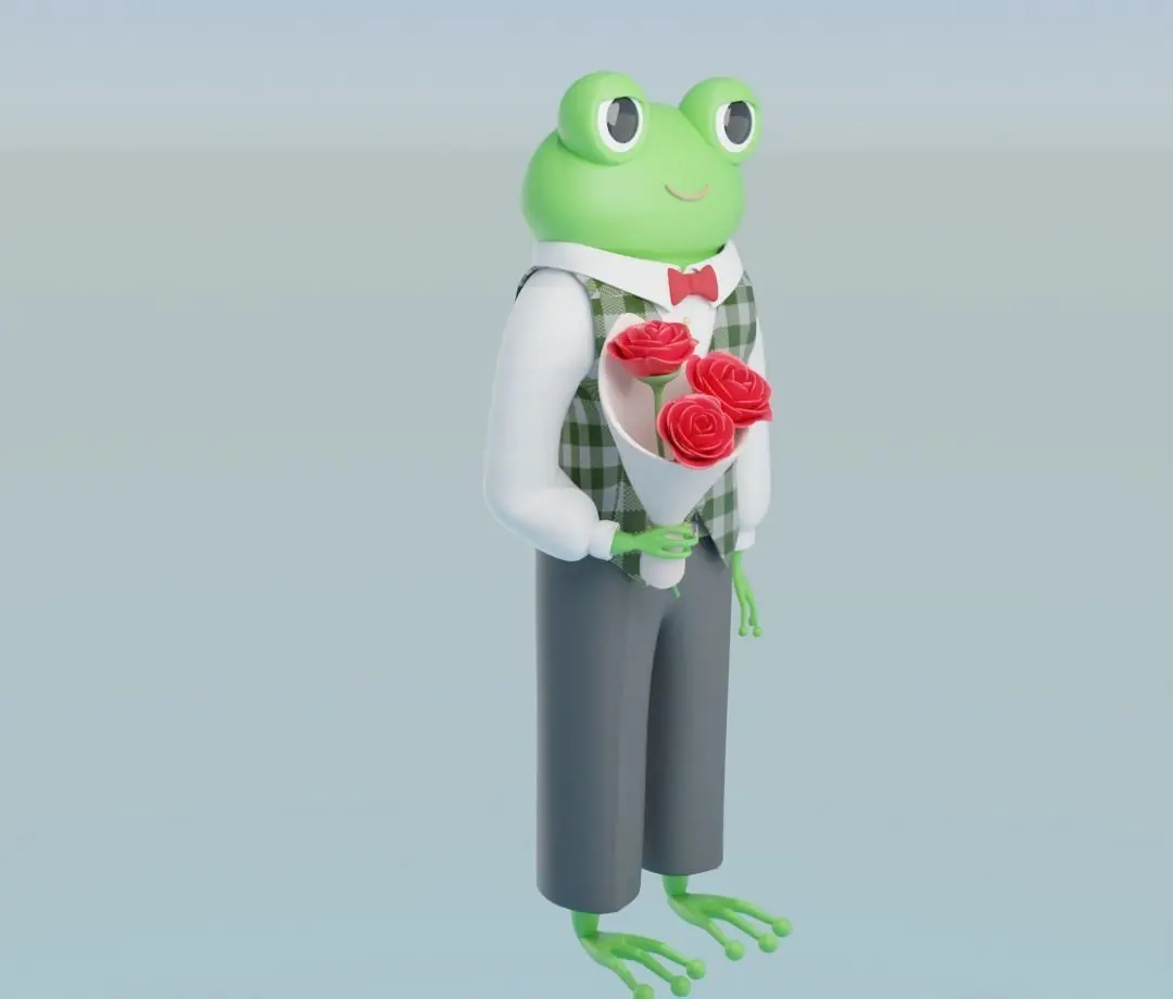 Please enjoy this cute catoon style gentleman frog in a suit with a bouquet of roses. Please also note that some free textures from BlenderKit were used for this model.
