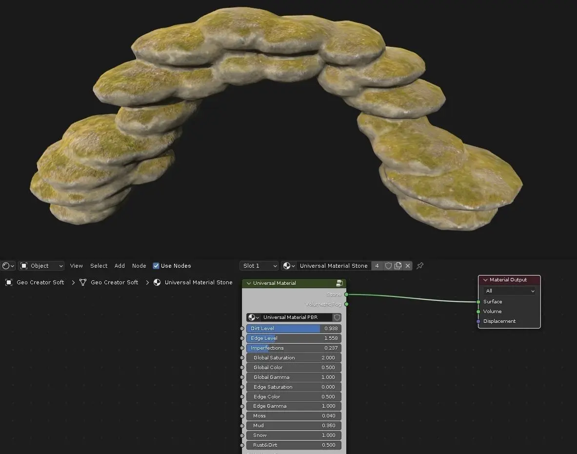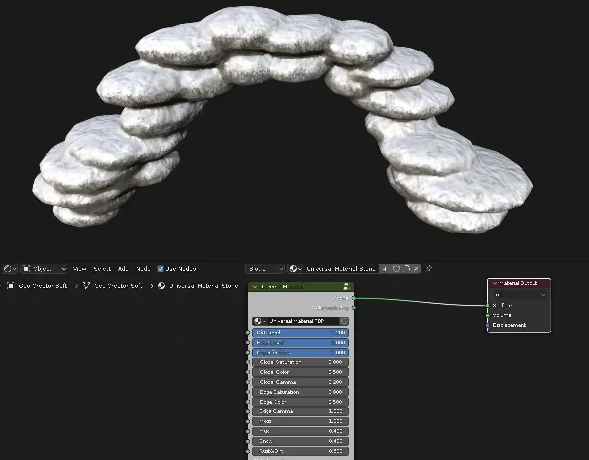 Geo Stone Creator for Blender 3D.Version from 3.1+Geaometry Nodes + Real Time Snow, Moss, Dirt, Mud effects.Eevee Real Time Ready.Volumetrics Clouds with 3D formation for Cycles.