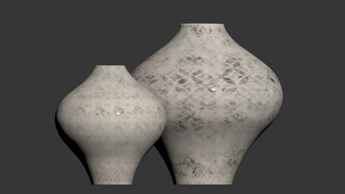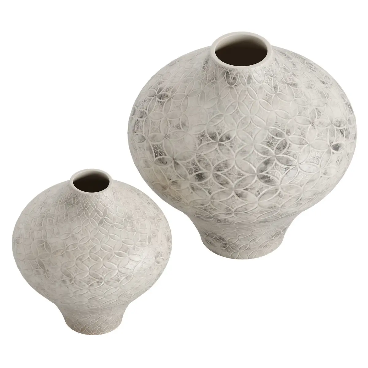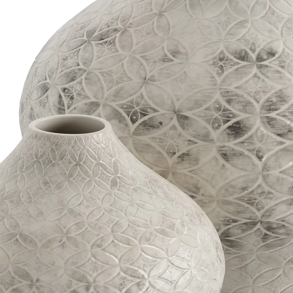Geo's dramatic curves showcase its lacy stamped pattern, called out by a white glaze. A statement-making vase for a console table or bookcase.