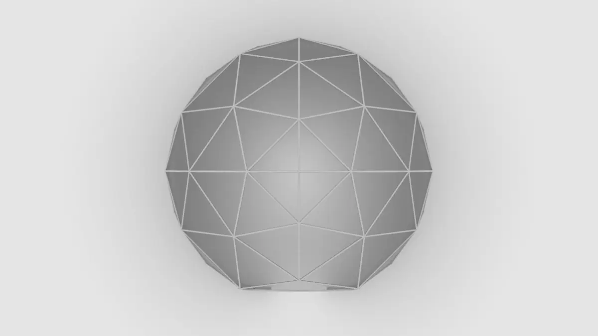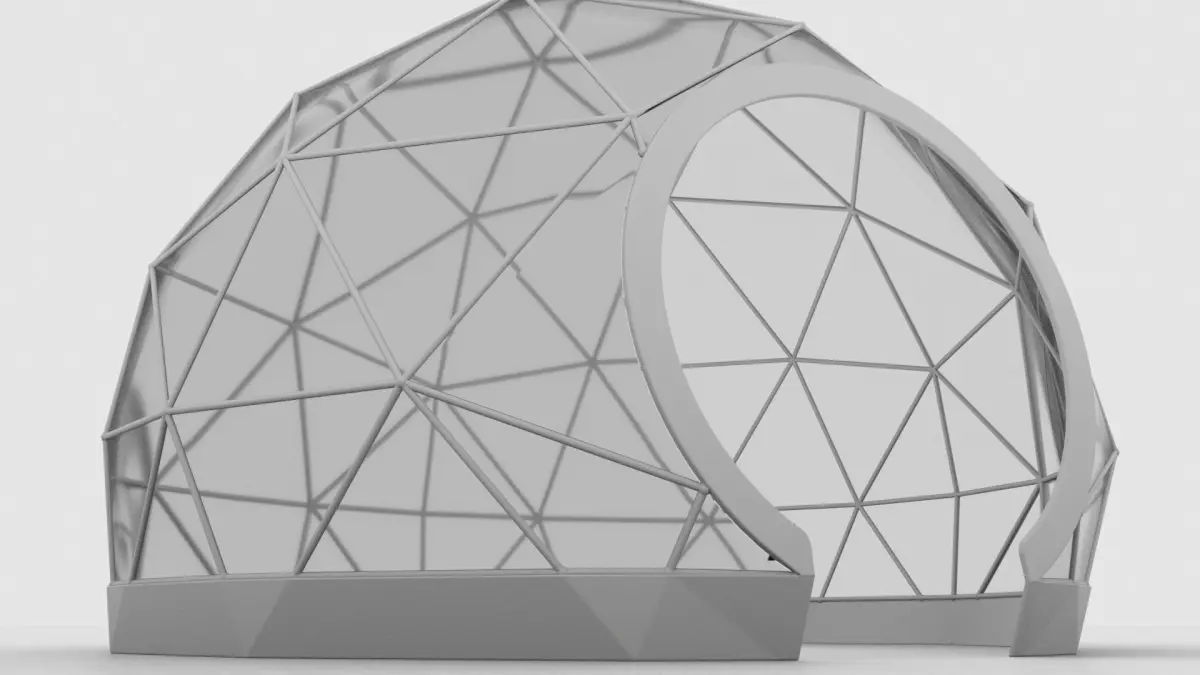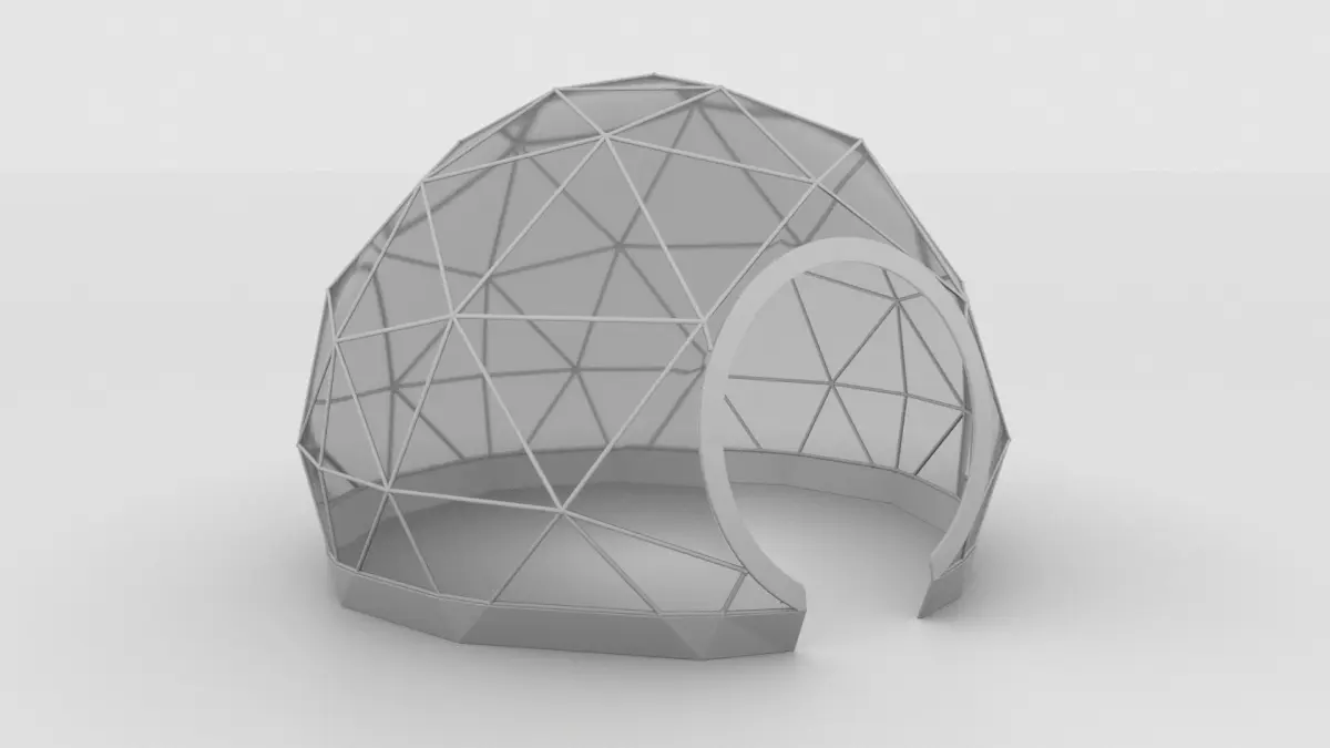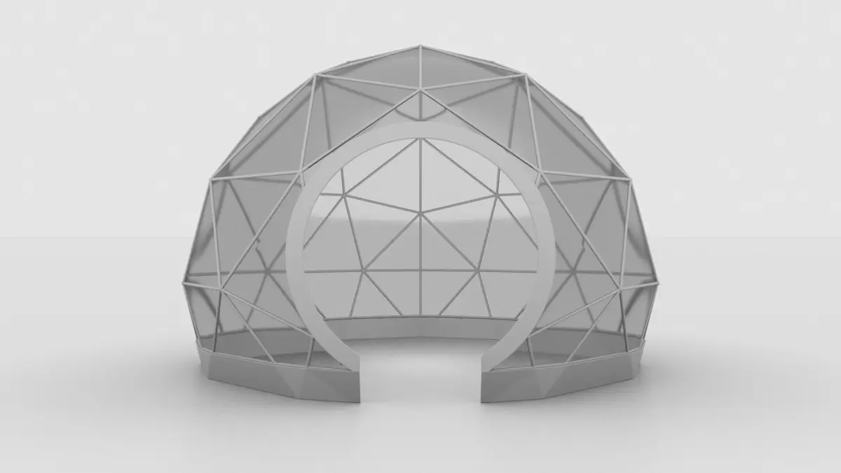 Geodesic tent with circular entrance. Scaled at 18.6' Wide X 18.2' Deep X 9' Tall (Metric: 5.6m X 5.5m X 2.75m)