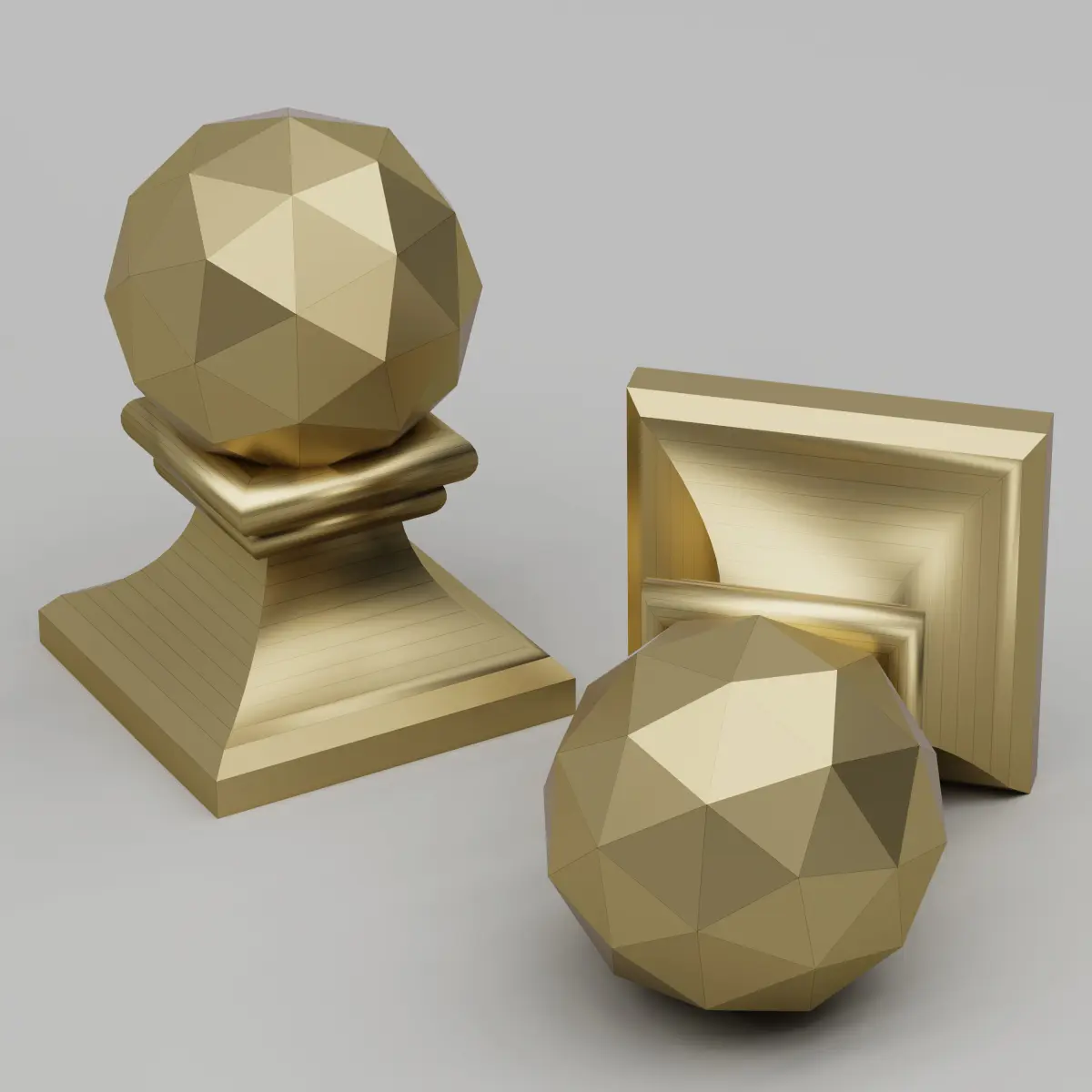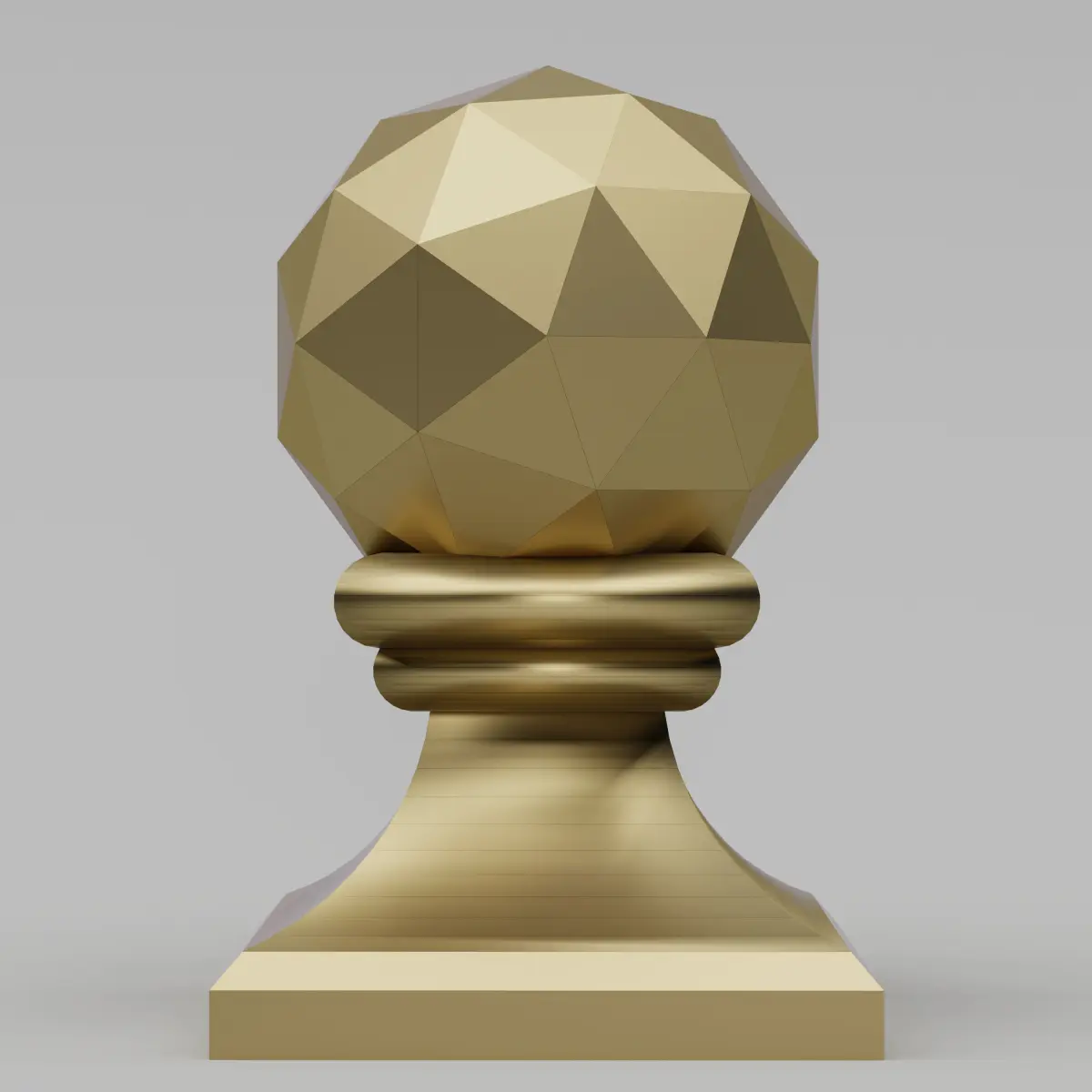 Enhance your architectural and interior design projects with this meticulously crafted geometric brass finial. This 3D model features a spherical design with multiple facets, creating a stunning visual effect. The finial sits atop a cylindrical base adorned with concentric rings, adding a touch of elegance and sophistication.