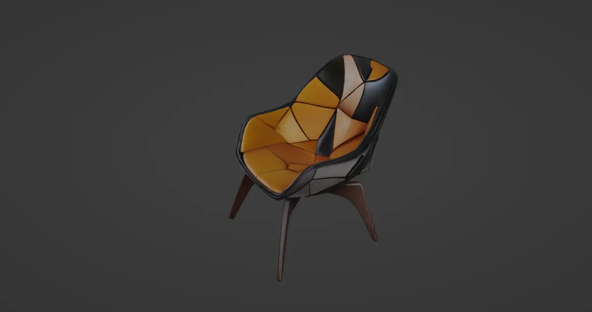 This stunning 3D model showcases a uniquely designed geometric chair, blending modern aesthetics with luxury craftsmanship. The seat and backrest are composed of intricate polygonal leather panels in a warm orange and black contrast, creating a sophisticated and futuristic appearance. The ergonomic design ensures comfort while maintaining a visually striking structure. The frame is finished with a high-quality black gloss, emphasizing the seamless integration of textures.