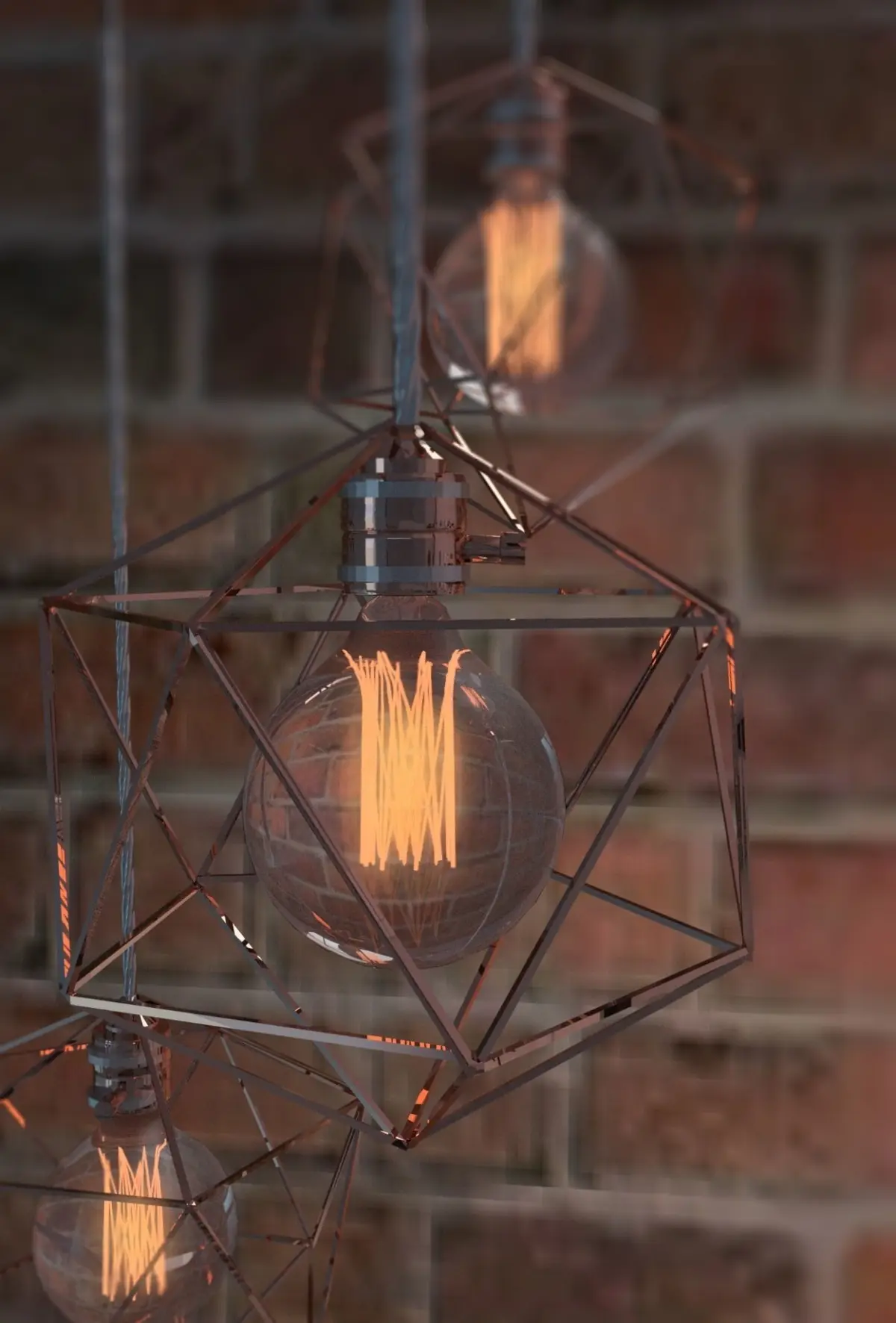 Light bulb lamps with geometric casing. Files include three lamps. Includes spiral chord, bulb, geometric case, switch, base, and filament. Textures not included except for blender file. Case easily removed. Mid Poly.