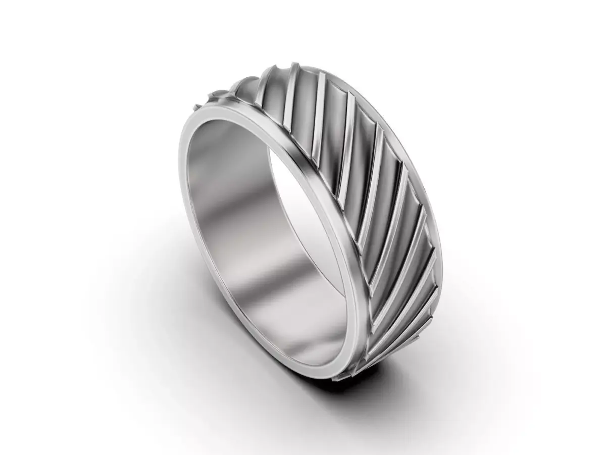 Hello friends, I offer you one more model of a jewelry, I remind you that this is only 3d model, in order for you to get the finished product you need to contact a jewelry company.A bold and modern men's ring featuring a dynamic, repeating gear or industrial tread pattern. The deep, angled grooves create a strong, textured look with a clean finish.Perfect as a unique wedding band or a stylish statement ring for everyday wear. Fully 3D print-ready and optimized for casting.Ring sizes: inner diameter – 20 mm. Recommended material - silver or gold! Approximate metal weight (for ring size 20 mm): gold 14k – 9.74 grams; gold 18k – 11.66 grams; silver 925 Sterling – 7.84 grams. Model volume (for ring size 20 mm) - 756,356 cubic mm.Model avalible in STL format for prototyping. Geometry is healed, and fixed all the bad with RP Magics software You can check out my other products by clicking on the author name artchahur. Please don't forget to rate the model you purchased. On all questions write, I will answer. Good shopping for you.