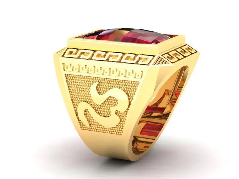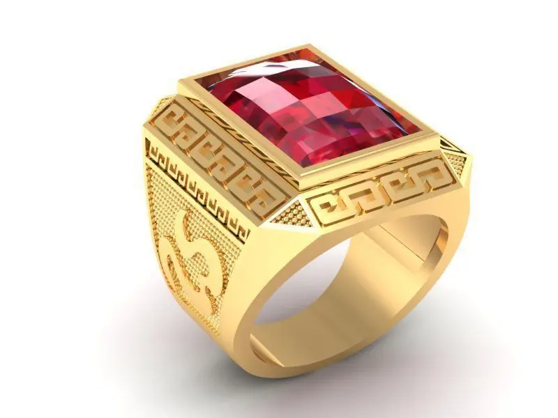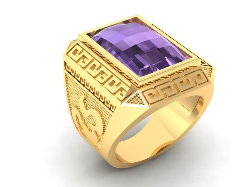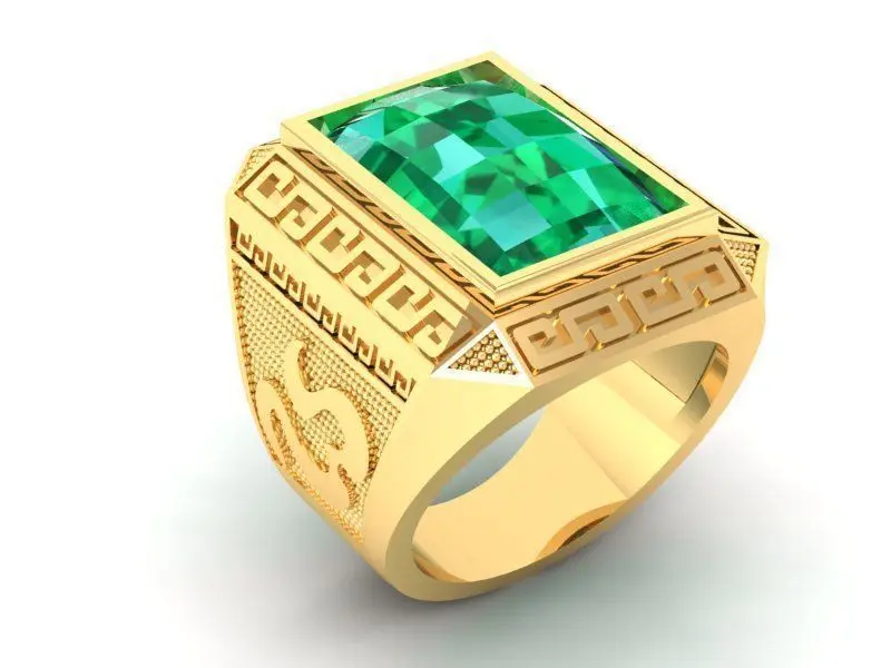 This geometric gemstone signet men’s ring showcases a bold and powerful design with a large rectangular-cut gemstone set in a solid gold band. The sides of the ring are decorated with intricate engraved patterns, adding a sense of tradition and luxury. Its wide shank ensures durability and comfort, making it a perfect accessory for men who appreciate strong and unique jewelry.