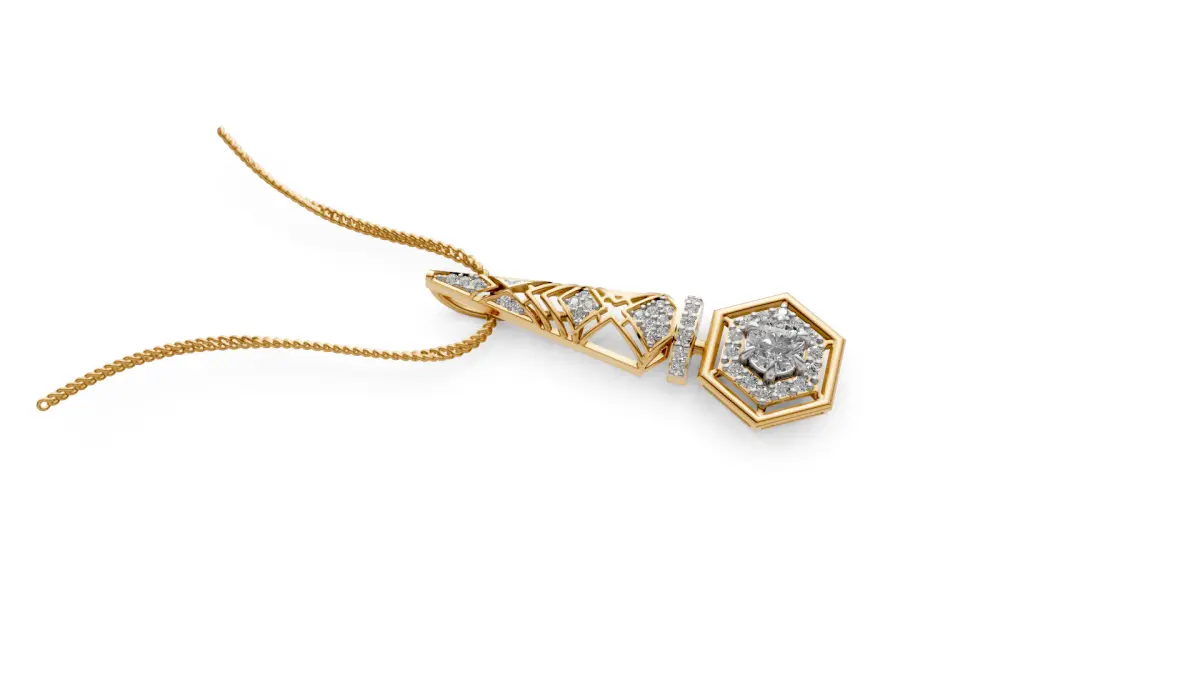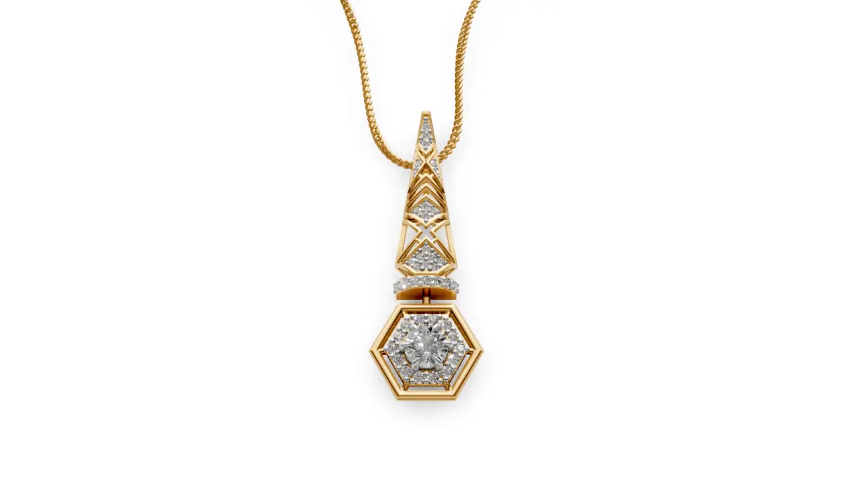 Elevate your everyday elegance with the Geometric Grace pendant. This exquisite piece, crafted in 3 grams of luxurious 18k gold, showcases a captivating blend of modern design and timeless sophistication. The pendant's unique structure features a striking hexagonal base, cradling a brilliant central diamond, while a beautifully detailed, geometric spire ascends gracefully. Delicate diamonds are meticulously set throughout, adding a touch of captivating sparkle. Perfect for adding a refined touch to any ensemble, the Geometric Grace pendant is a testament to understated luxury and feminine charm.