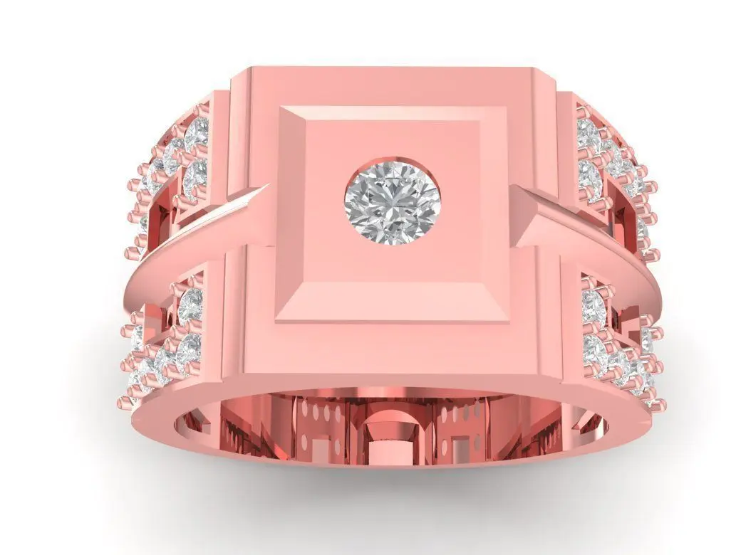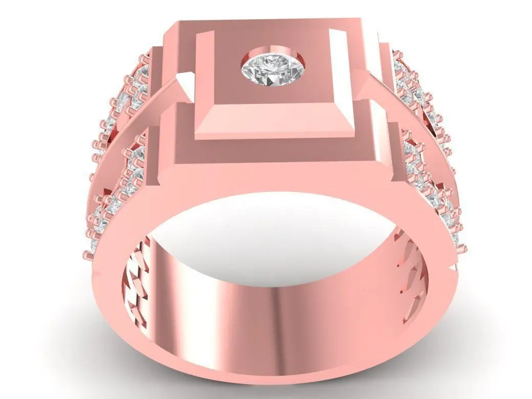This geometric luxury men ring features a bold square-top design combined with multiple diamond accents arranged along the sides and around the central setting. The modern, architectural structure gives the ring a powerful masculine look, making it ideal for fashion jewelry collections, custom gifts, or premium accessory lines. The clean edges, layered surfaces, and symmetrical layout highlight the craftsmanship and add strong visual depth.