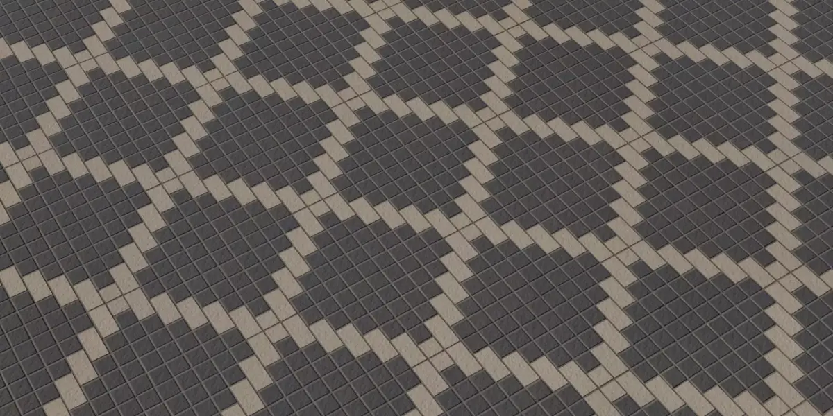 A seamless, photorealistic geometric mosaic tile material featuring alternating charcoal and sand‑beige squares arranged into repeating diamond rings for bold, contemporary interiors and plazas in games and archviz. Subtle bevels, crisp grout, and micro surface grain read cleanly in closeups while tiling perfectly over large floors without visible seams under HDRIs or directional light. Calibrated PBR maps maintain realistic specular roll‑off and grout depth for convincing detail at grazing angles across realtime and offline engines.