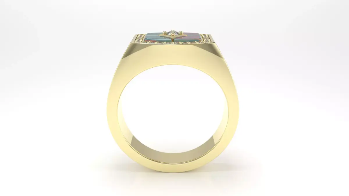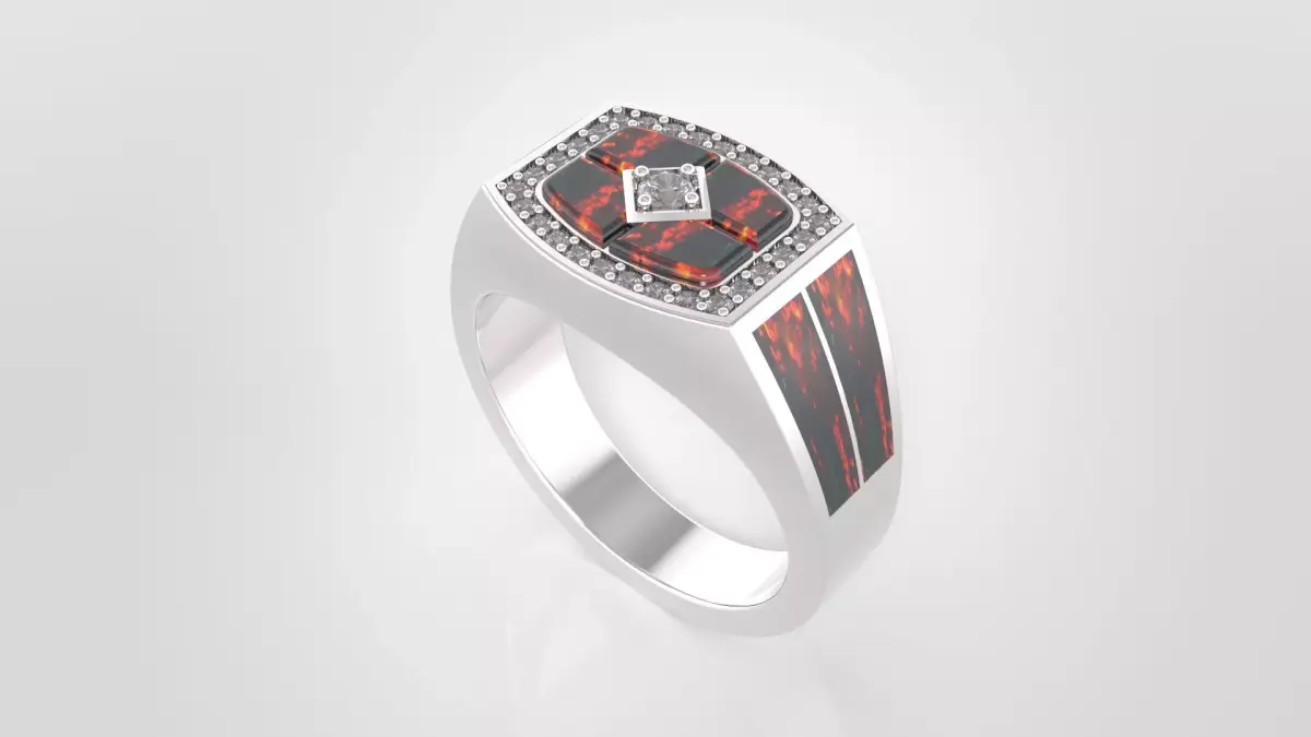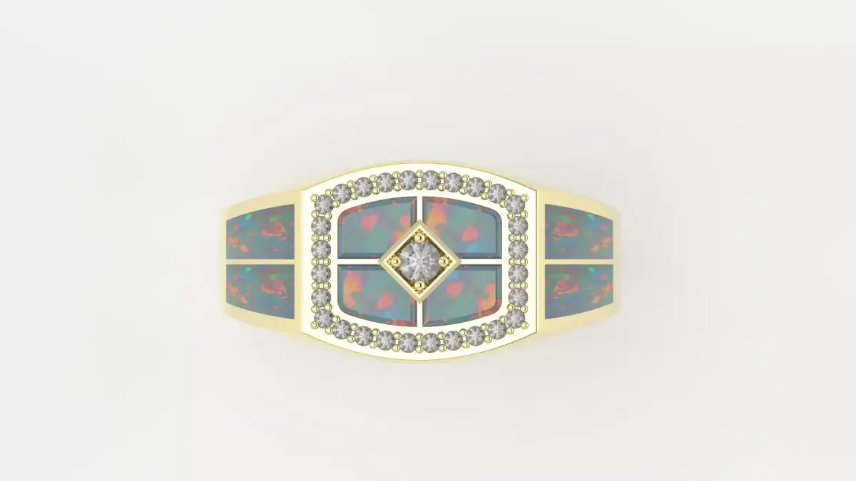 Elevate your jewelry collection with this stunning Geometric Men's Signet Ring, meticulously designed in MatrixGold. This 3D model features a modern, masculine aesthetic, combining the fiery elegance of Opal inlays with a classic diamond halo setting.