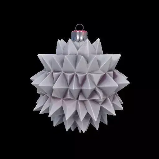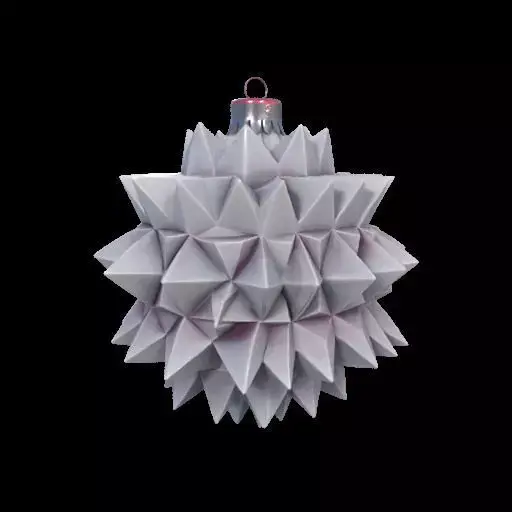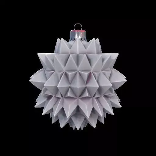 BUY HERE OR FOLLOW MY PATREON TO GET IT FREEA modern, geometric Christmas ornament shaped like a starburst, crafted from numerous white and gray triangular facets with subtle textures. The metallic silver cap and hanging loop complete the minimalist design. Suspended against a smooth gray gradient, soft diffused lighting highlights the three-dimensional form and intricate geometry, creating an elegant and refined holiday accent