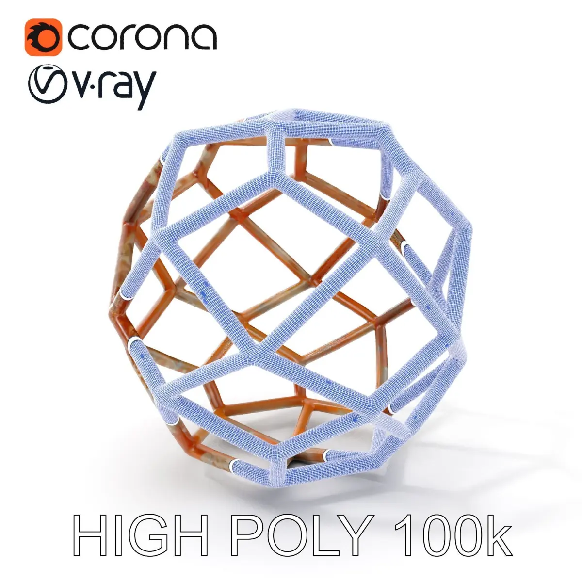 Use this model to create stunning visualizations of geometric installations, abstract art pieces, or architectural elements. Its wireframe structure and rust texture add a unique industrial aesthetic, making it versatile for various design themes.
