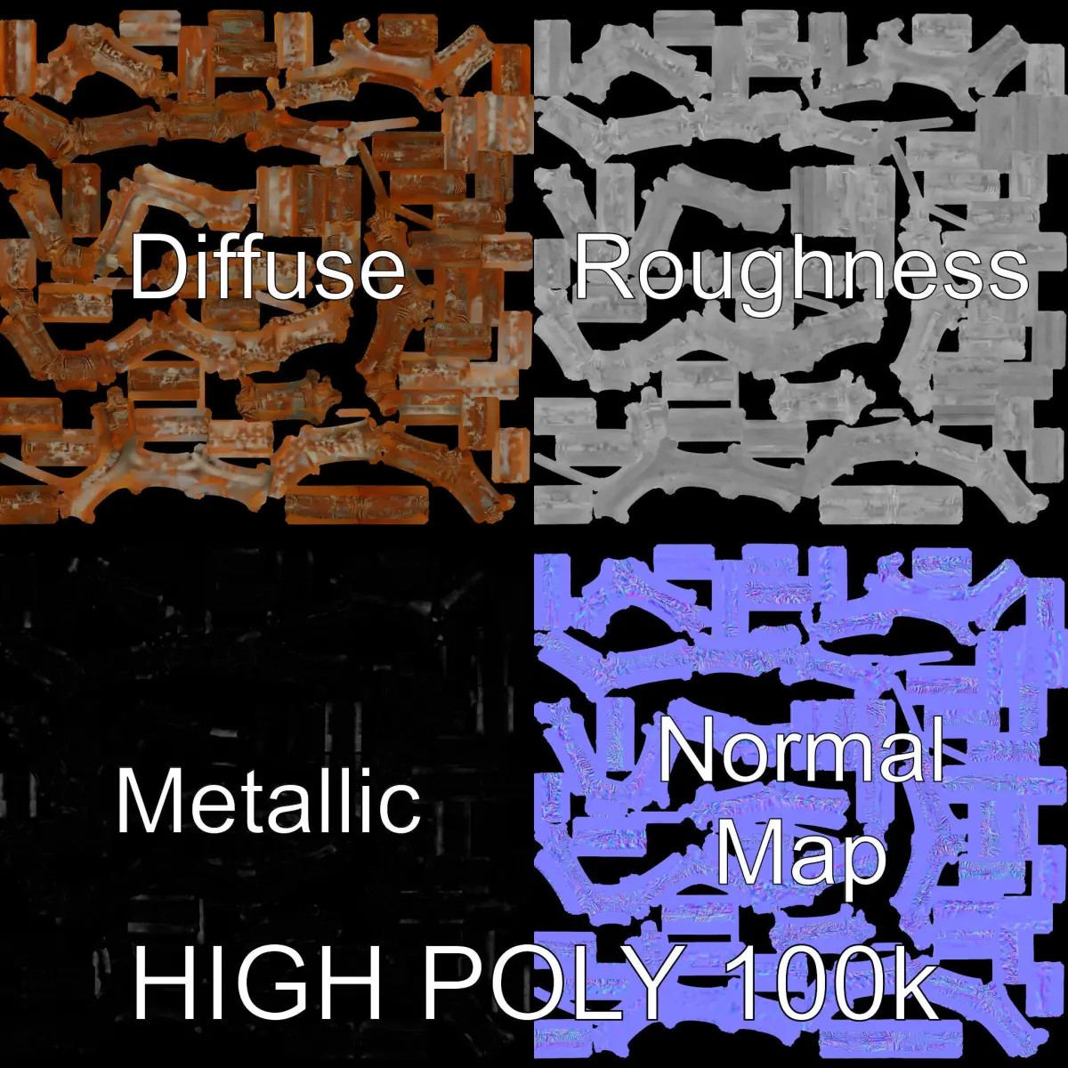The PBR textures (Diffuse, NormalMap, reflection/roughness/metallic) are meticulously crafted, with a resolution of 4096x4096, ensuring high-quality renders in any modern engine. All UVs are accurately unwrapped with no overlaps, promising seamless integration into projects.