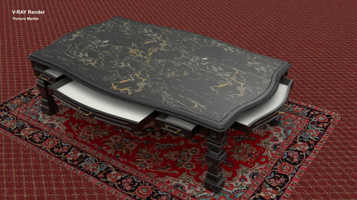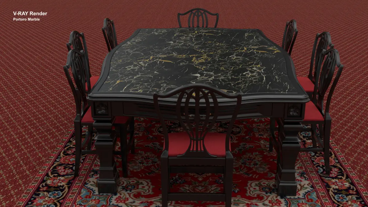A classically styled Dining Table (including it's Dining Chairs) Inspired by Georgian period design. Resplendant with Oak Burl, gold detailing & Portoro marble. (OtherMarbles are included)It can be dowloaded as NURBS or Polygon Mesh.