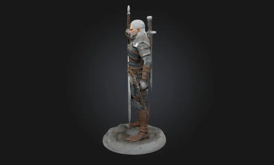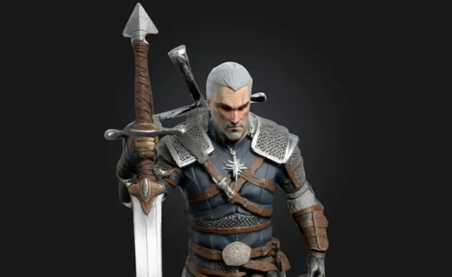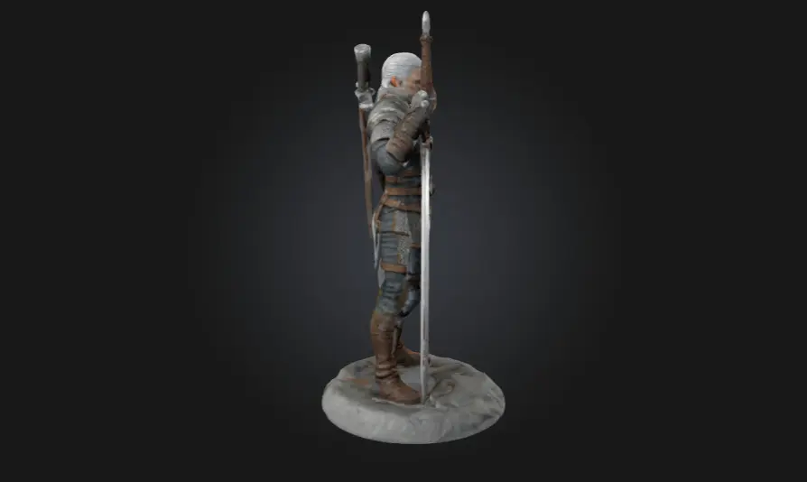 This is a highly detailed 3D printable figure of Geralt of Rivia, inspired by The Witcher series. Designed as a collectible toy statue, this model captures Geralt in a dynamic battle-ready pose, wielding his silver sword. His armor, leather straps, metal plates, and Witcher medallion are intricately crafted for maximum realism.