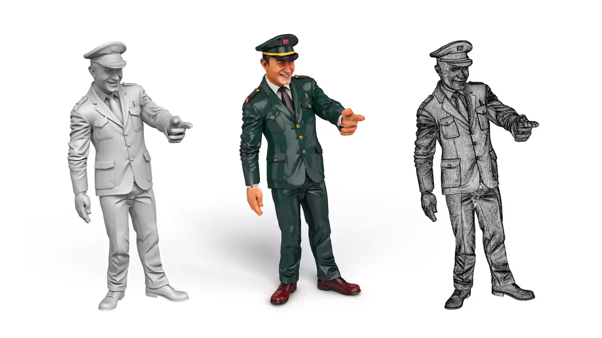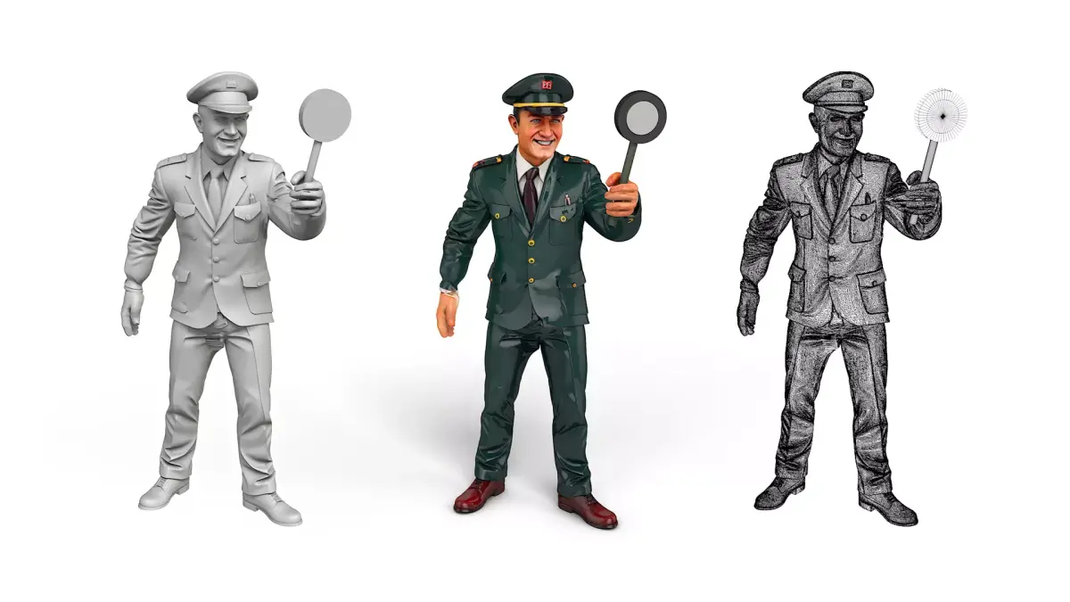 This German conductor in 10 different poses is perfect for your railway layout.He is so detailed that even as a 2 cm tall, single-color printed figure, the details are still very well visible.