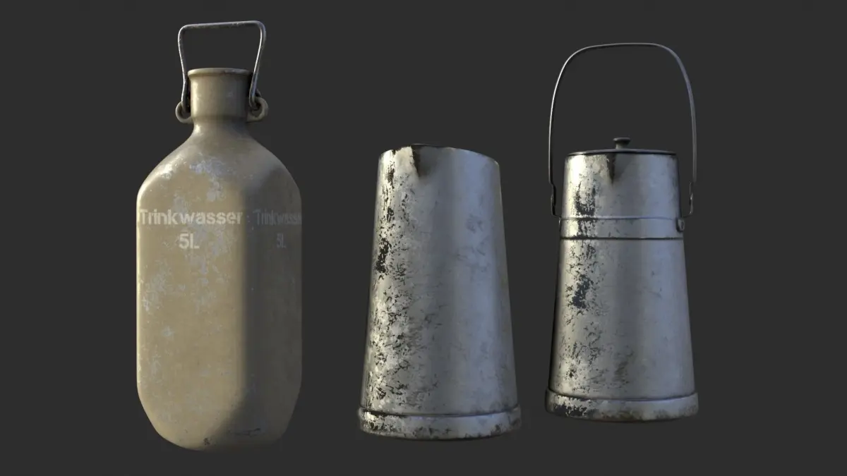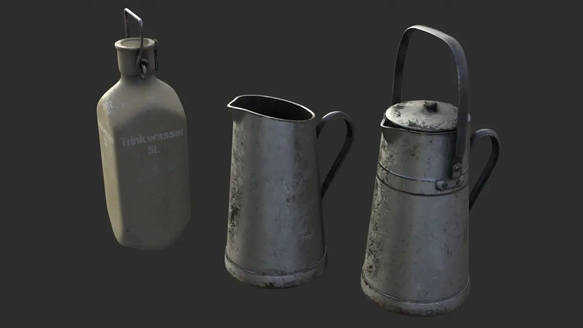 This asset includes 3 types of drinking liquids containers used by the German Army during the Second World War. A 5L metallic can, a 7,5L coffee pitcher and a 7,5L water pitcher. 2 of them (coffee pitcher and 5L can) are rigged and ready to be animated in any game engines.