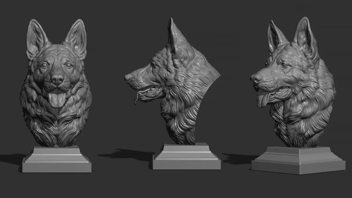 500K STL, OBJ triangulated, German shepherd bust on high base and low base merged